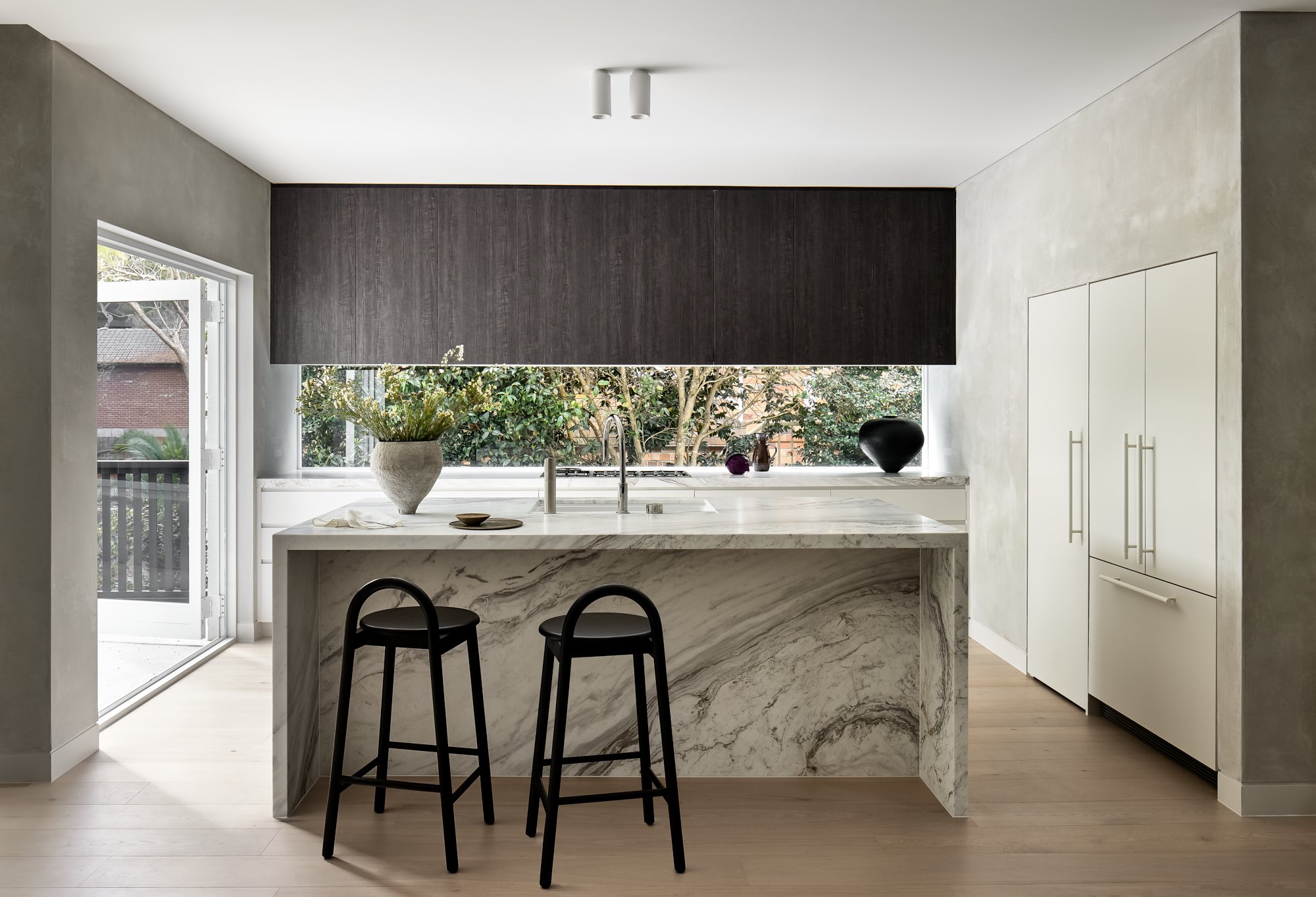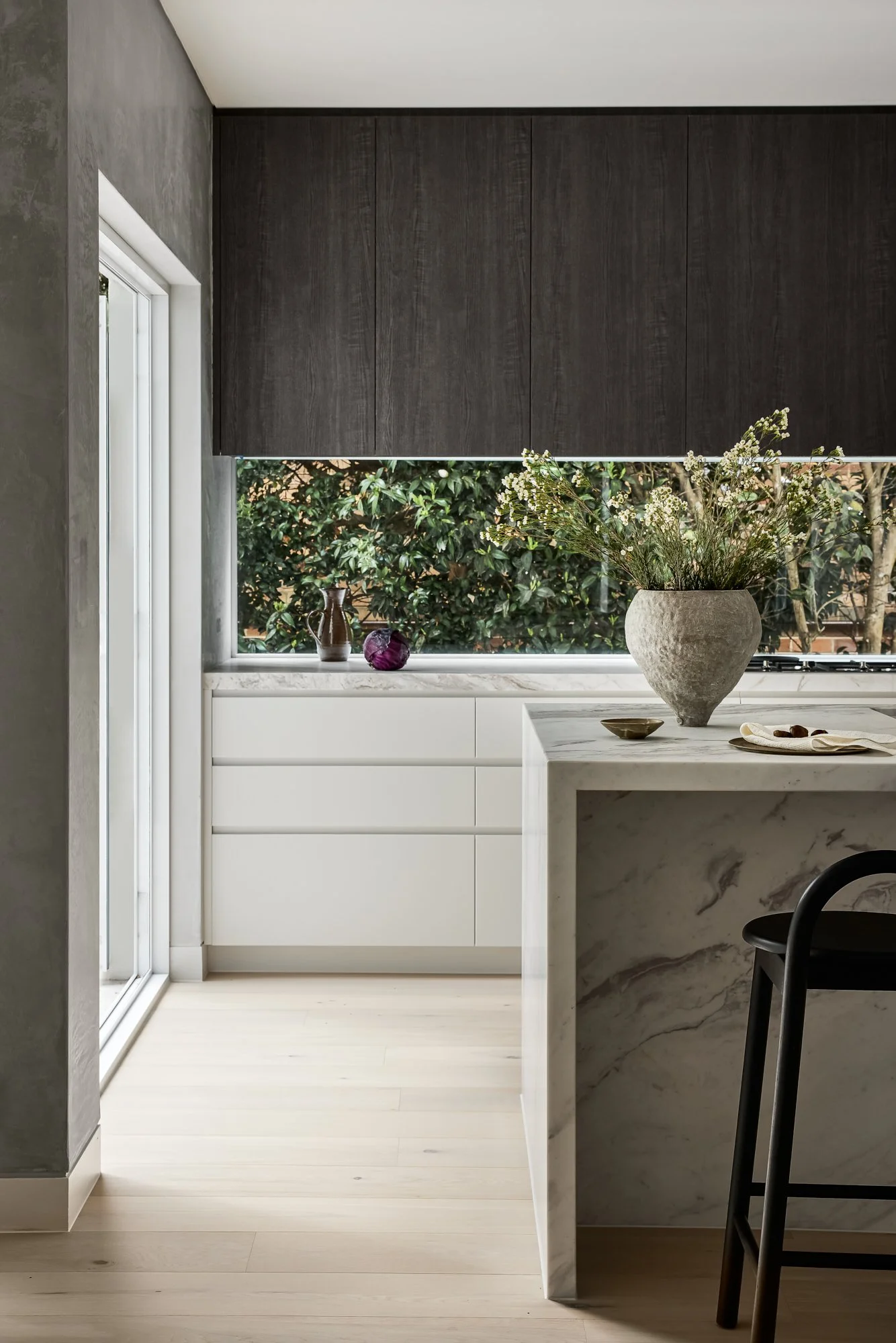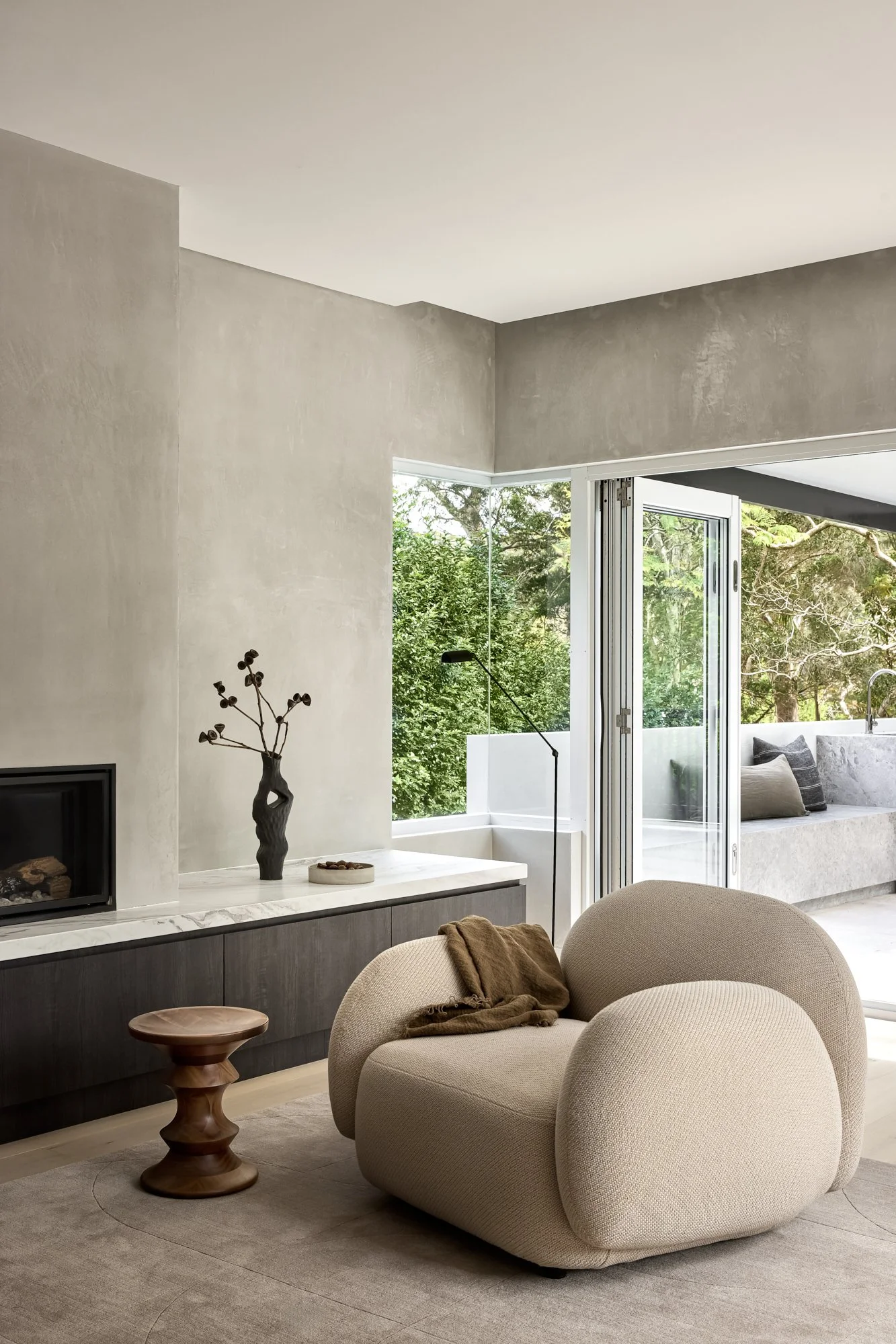 A 1970s Chatswood home transformed into a minimalist retreat - originally extended in the 90s and now completely reimagined for the owners who have lived here for 30 years. The design is defined by a commitment to natural materials and tranquillity: Venetian plaster walls in muted earthy tones, white-washed timber floors, and Volakas marble used dramatically across the kitchen island and benchtops. The shoot focused on capturing that tonal and textural restraint - the way the plaster walls shift in quality across the day, the interiors opening fully to the tree canopy beyond through full-height pivot doors, and the canopy-level bedroom that feels suspended in the surrounding greenery.