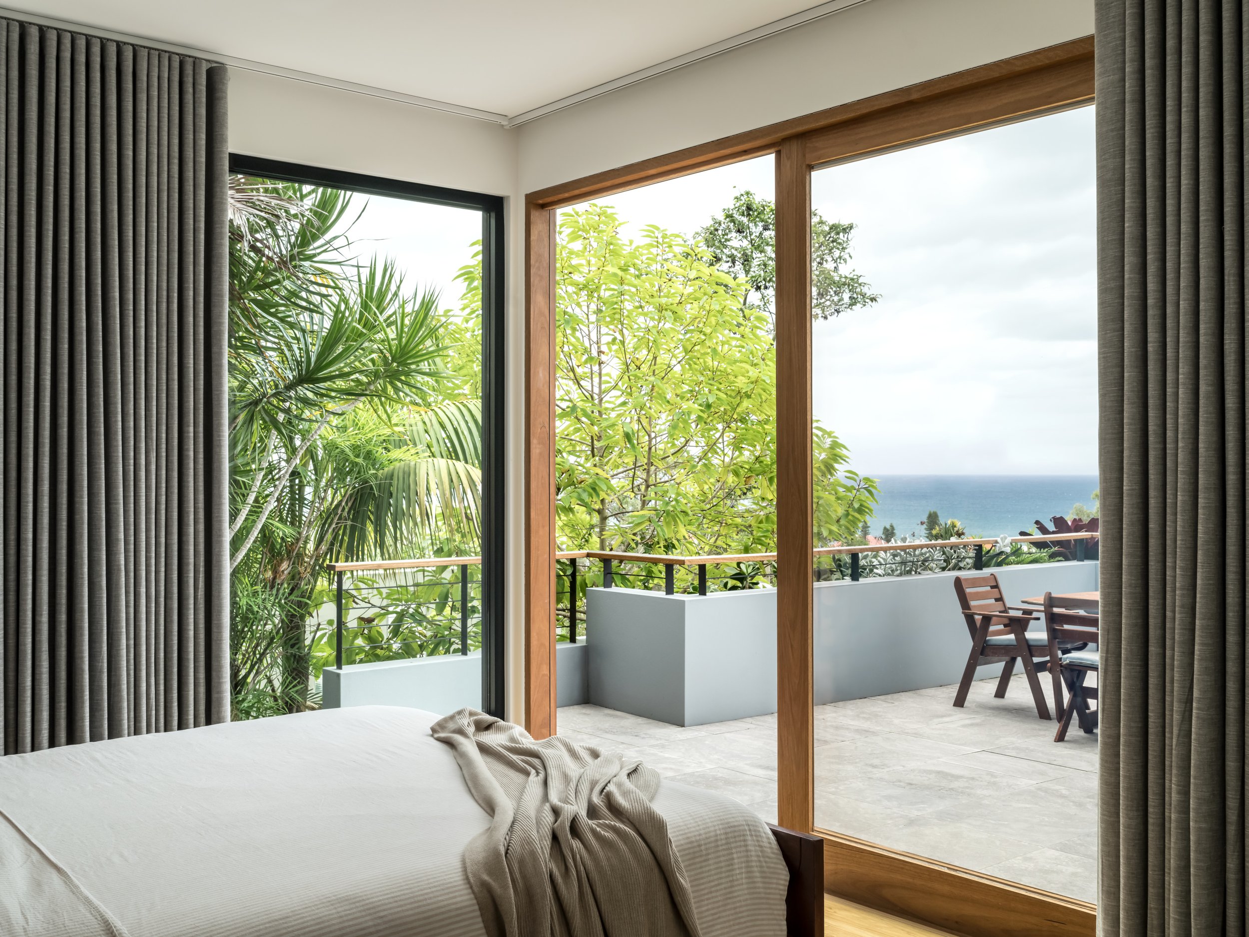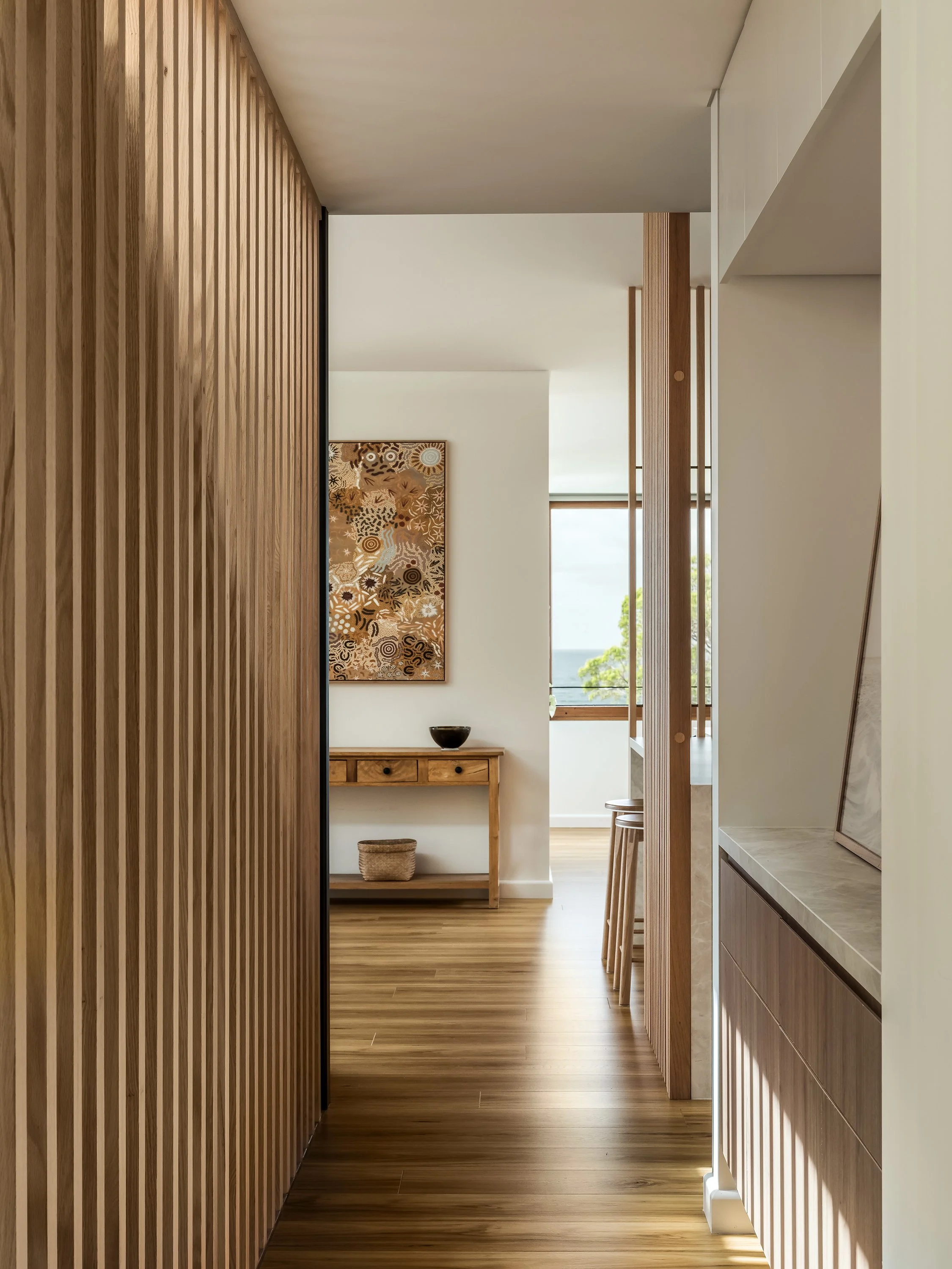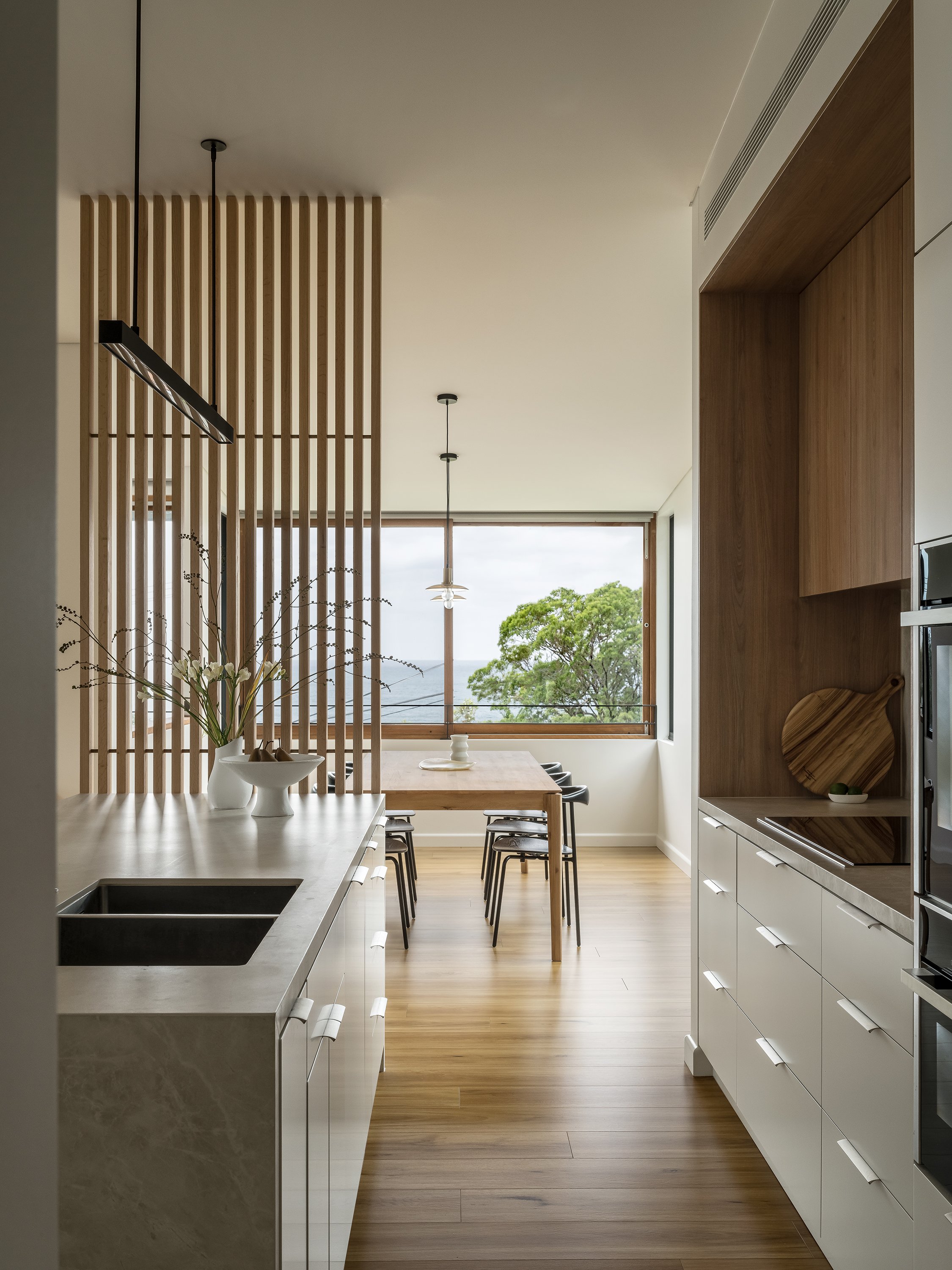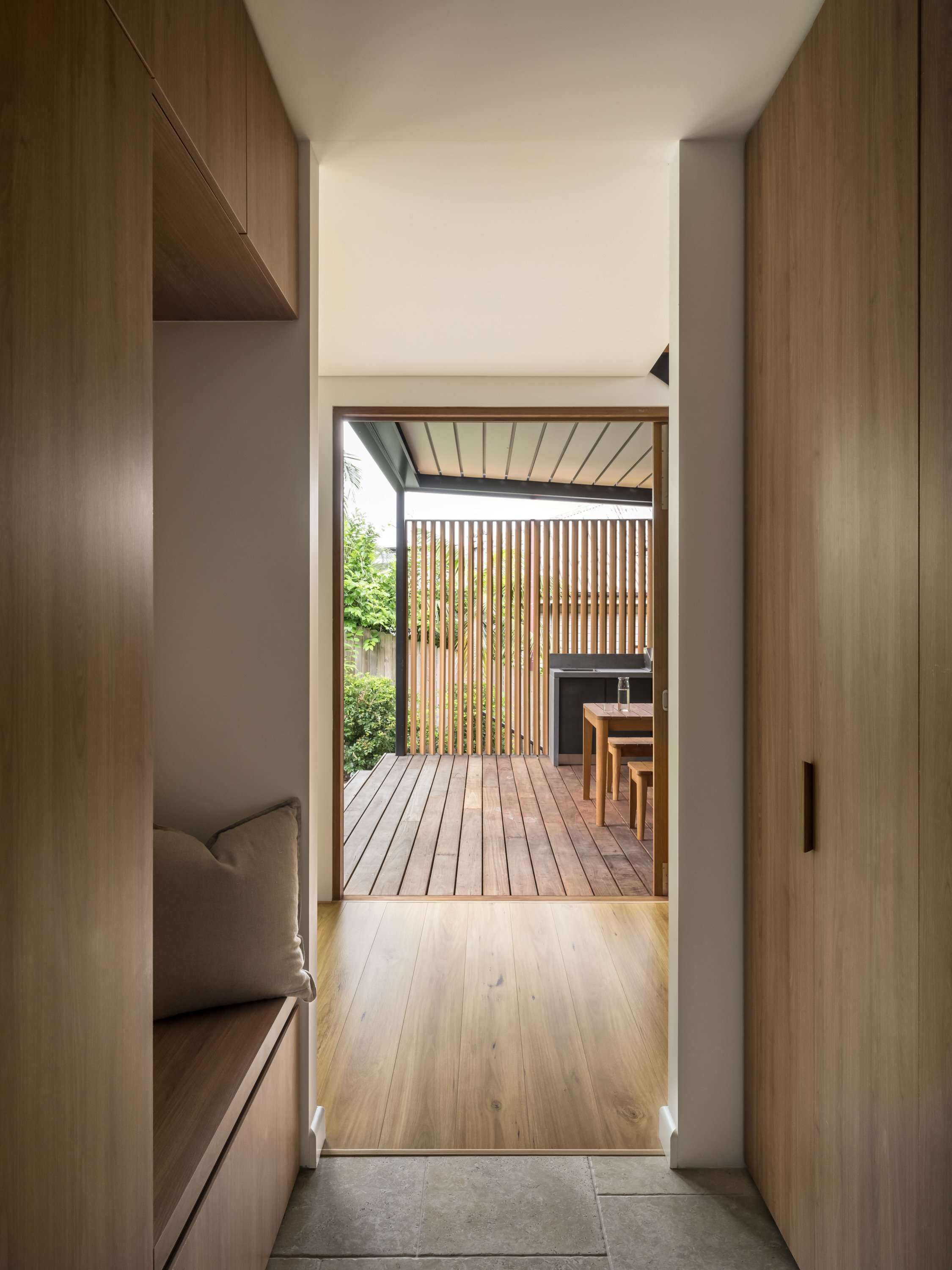 A 1970s Chatswood home transformed into a minimalist retreat - originally extended in the 90s and now completely reimagined for the owners who have lived here for 30 years. The design is defined by a commitment to natural materials and tranquillity: Venetian plaster walls in muted earthy tones, white-washed timber floors, and Volakas marble used dramatically across the kitchen island and benchtops. The shoot focused on capturing that tonal and textural restraint - the way the plaster walls shift in quality across the day, the interiors opening fully to the tree canopy beyond through full-height pivot doors, and the canopy-level bedroom that feels suspended in the surrounding greenery.