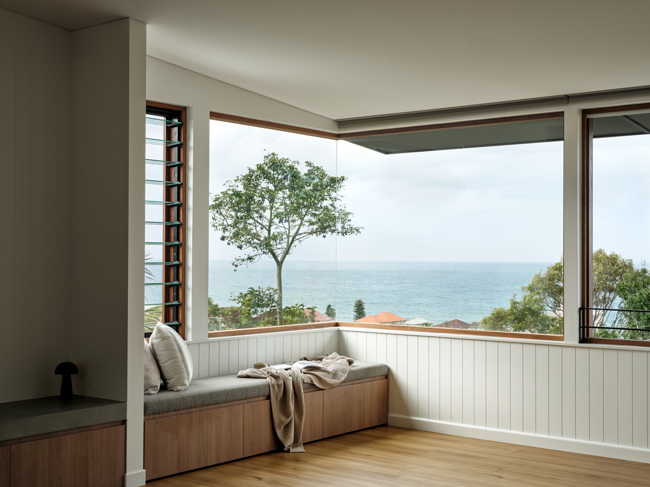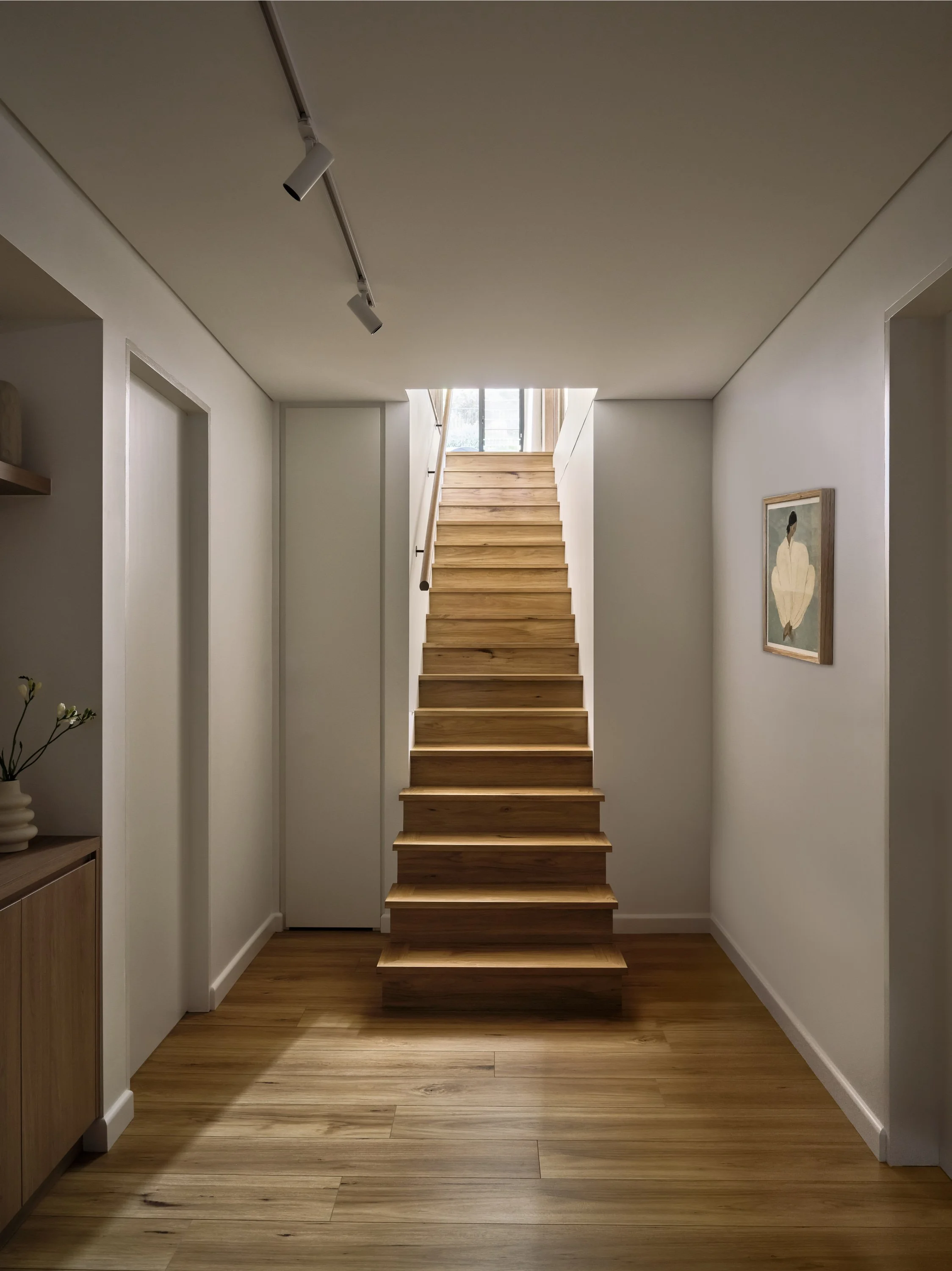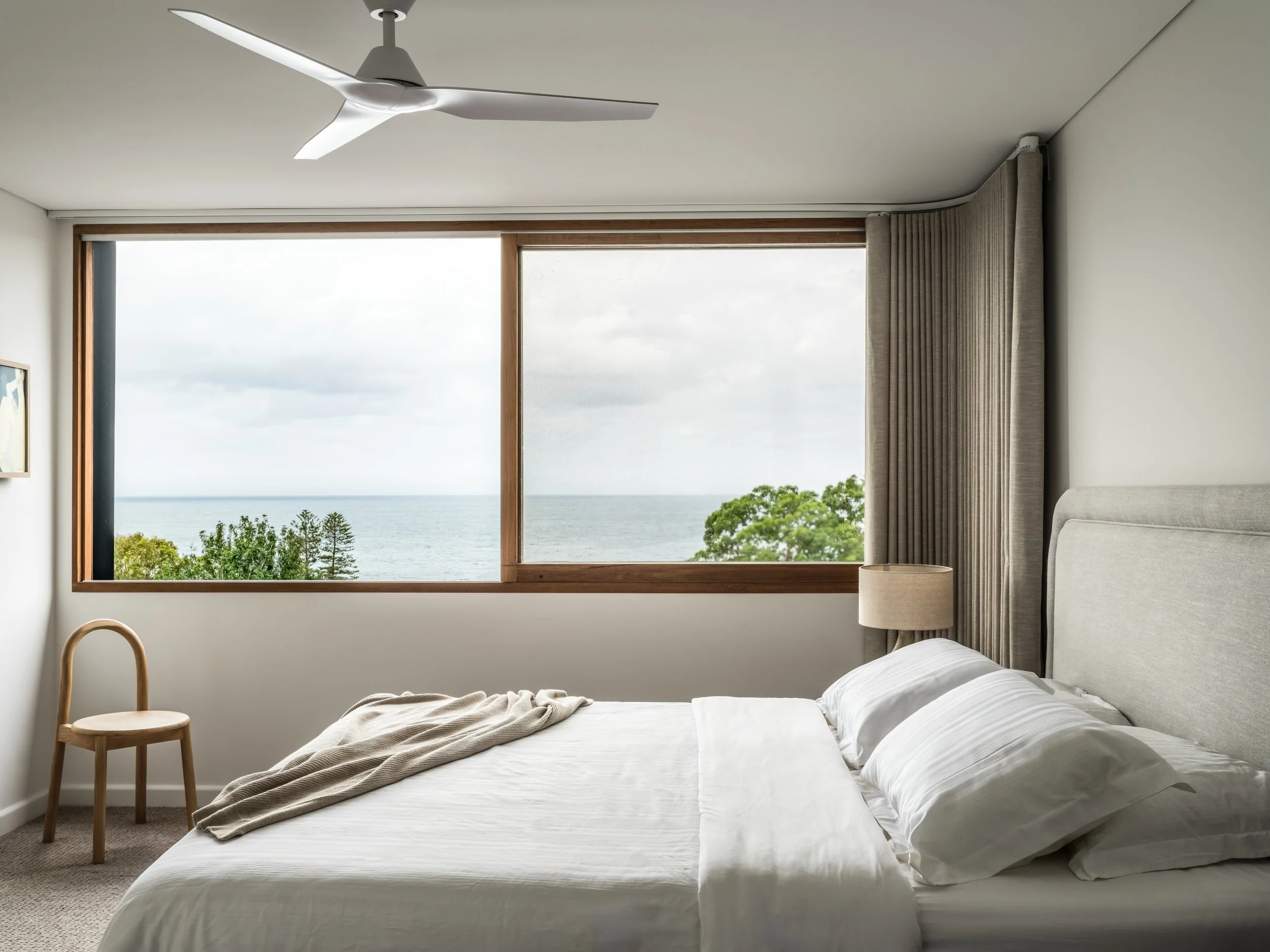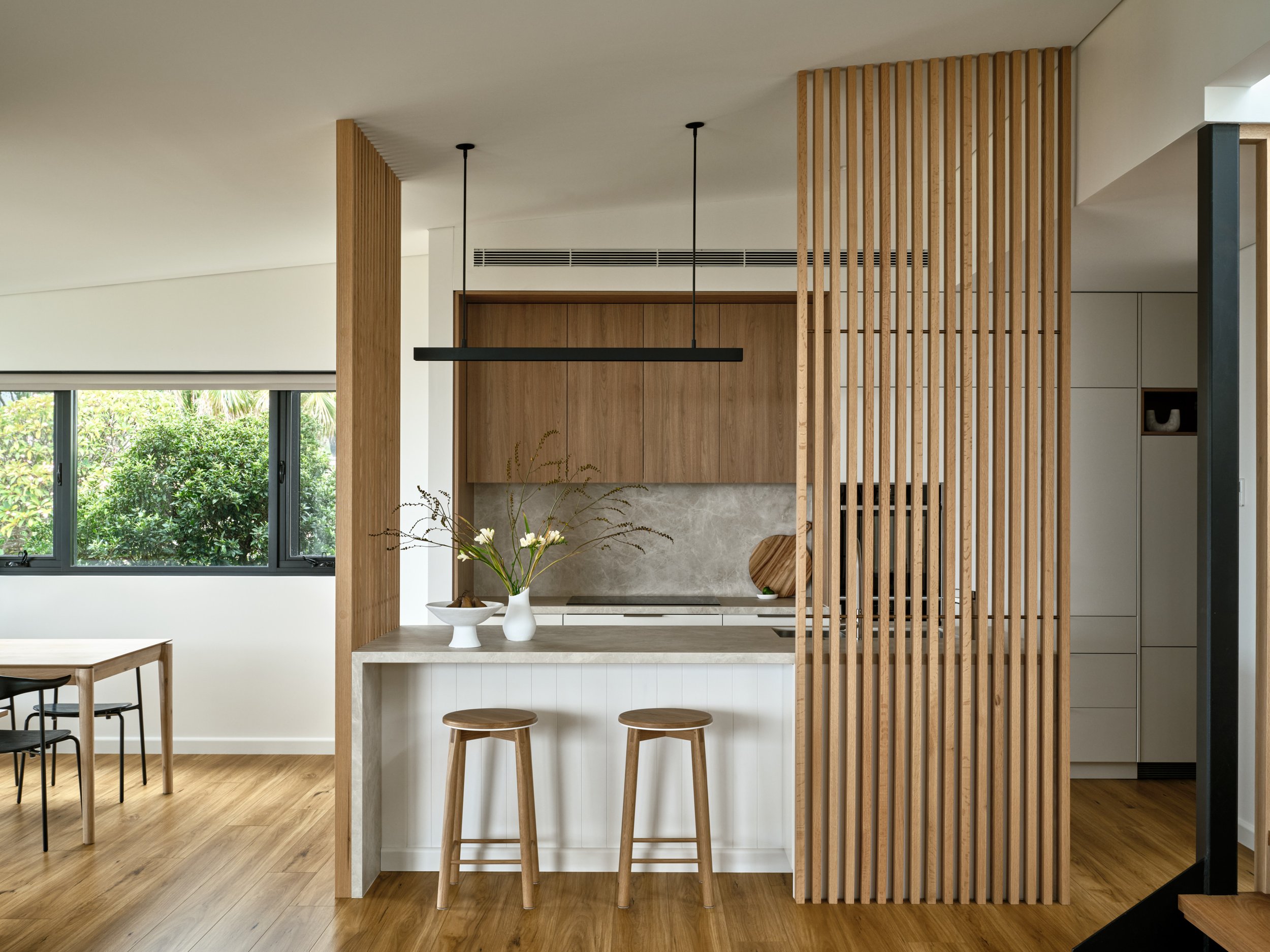 A 1970s Chatswood home transformed into a minimalist retreat - originally extended in the 90s and now completely reimagined for the owners who have lived here for 30 years. The design is defined by a commitment to natural materials and tranquillity: Venetian plaster walls in muted earthy tones, white-washed timber floors, and Volakas marble used dramatically across the kitchen island and benchtops. The shoot focused on capturing that tonal and textural restraint - the way the plaster walls shift in quality across the day, the interiors opening fully to the tree canopy beyond through full-height pivot doors, and the canopy-level bedroom that feels suspended in the surrounding greenery.