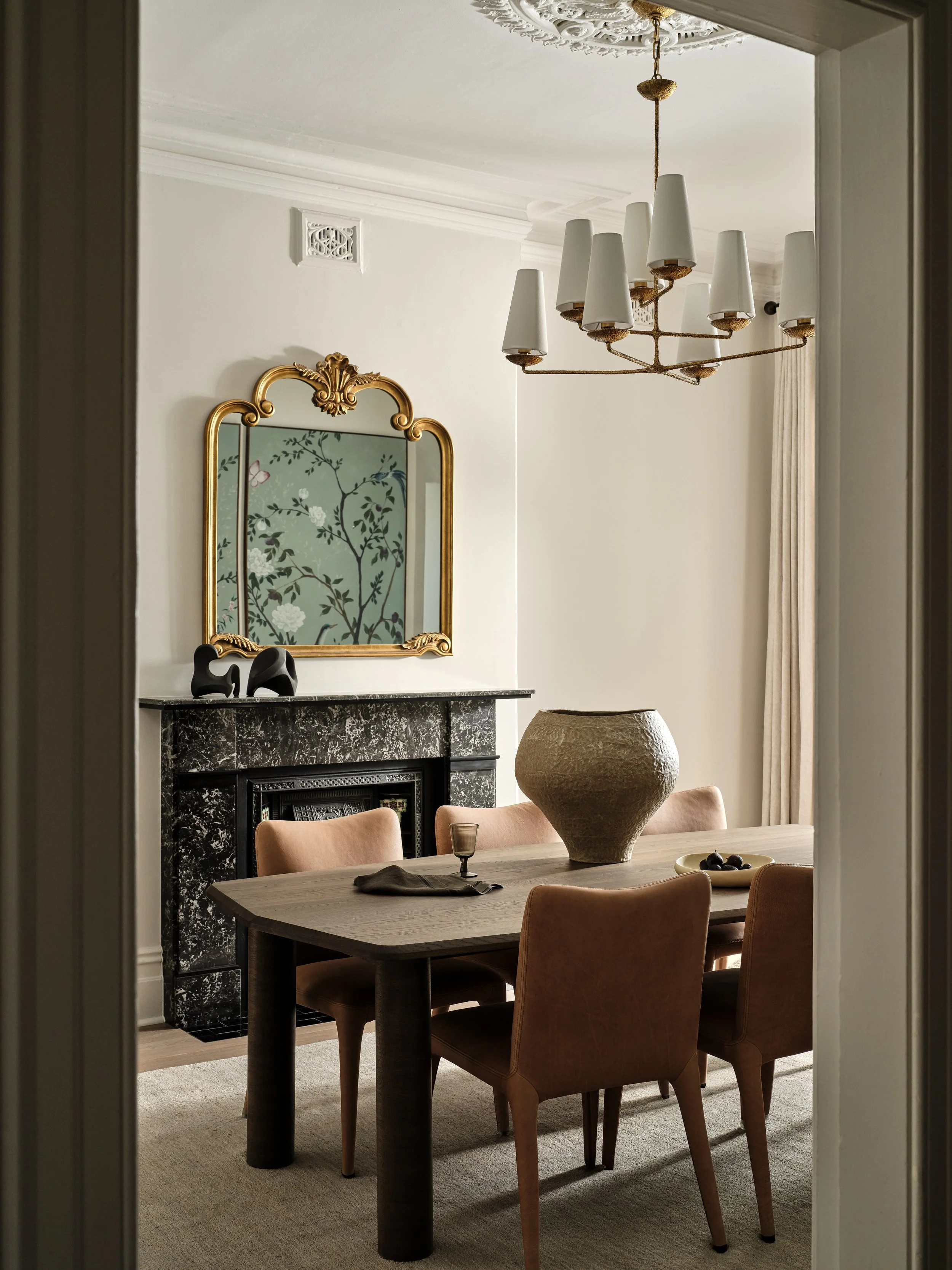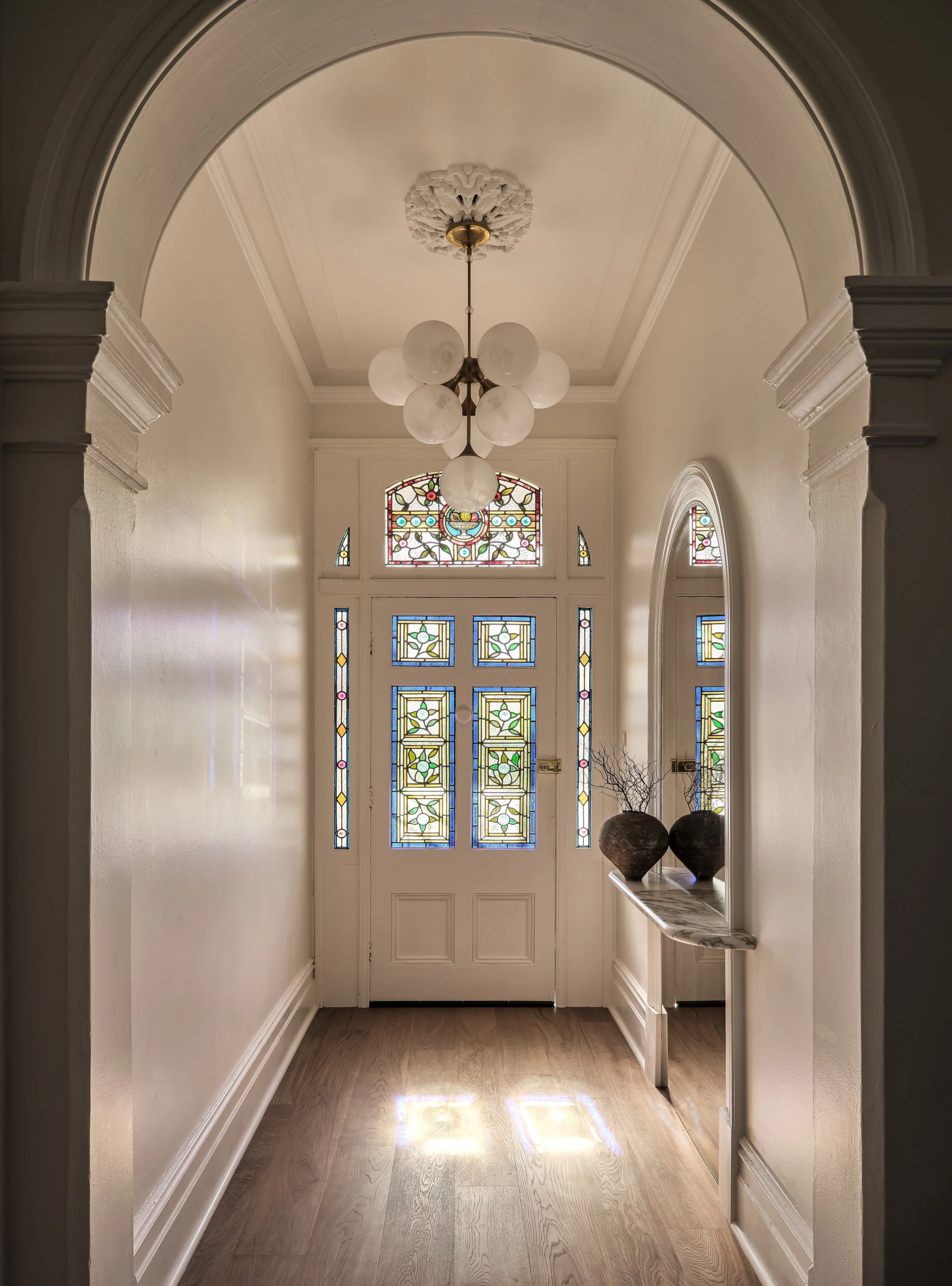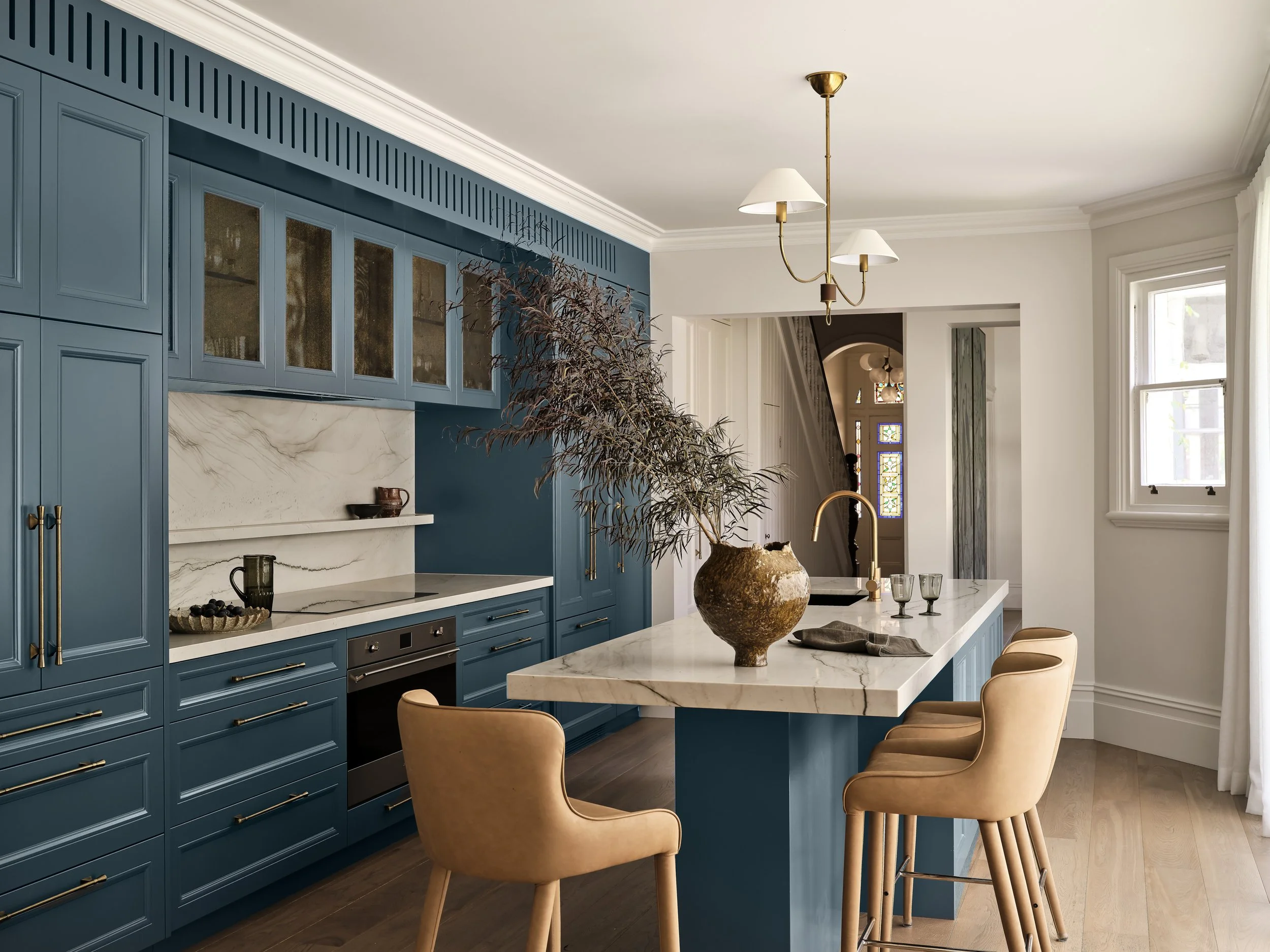 A grand late Victorian terrace in the heart of Glebe, just a stone’s throw from the city and harbour, meticulously renovated for a modern family while preserving everything that makes the original architecture special - ornate cornices, intricate plasterwork, and stained glass that casts coloured light through the entry hall. The shoot was focused on capturing that conversation between old and new: the cedar shingles and arched brick portico giving way to a bold blue kitchen with marble splashback, rich original fireplaces paired with contemporary artwork, and formal rooms brought to life with colour, warmth and natural light. The period detailing rewards close attention, and the photography leaned into that layering throughout.