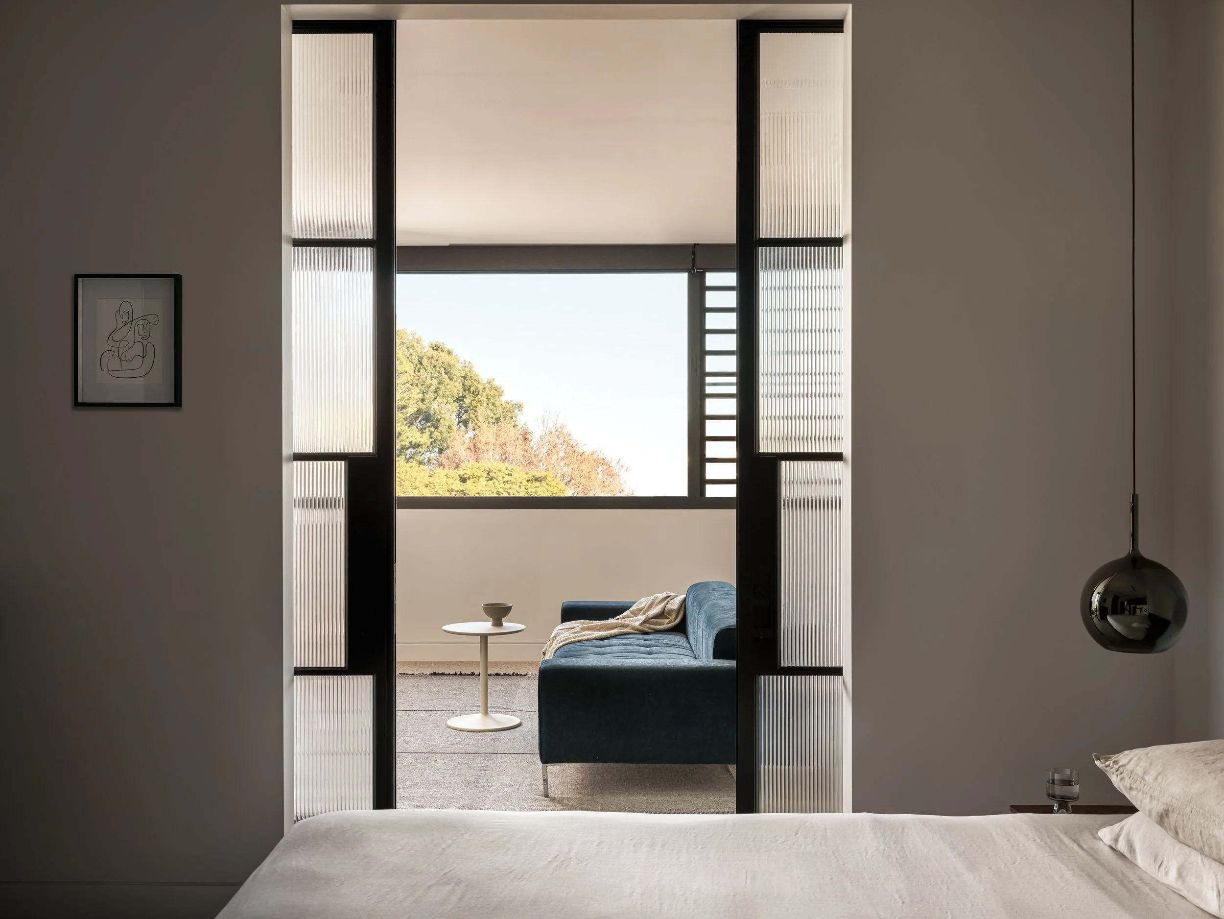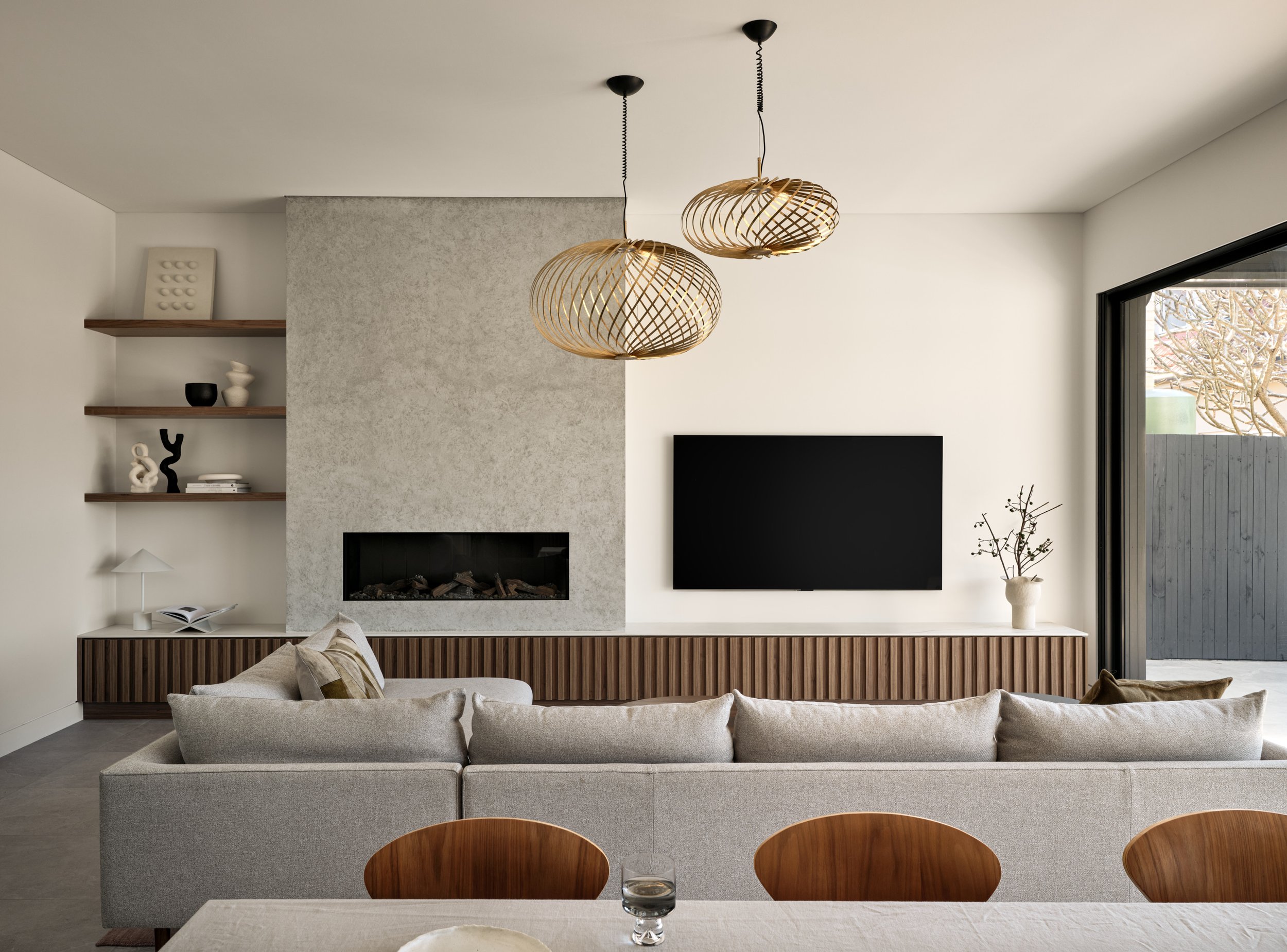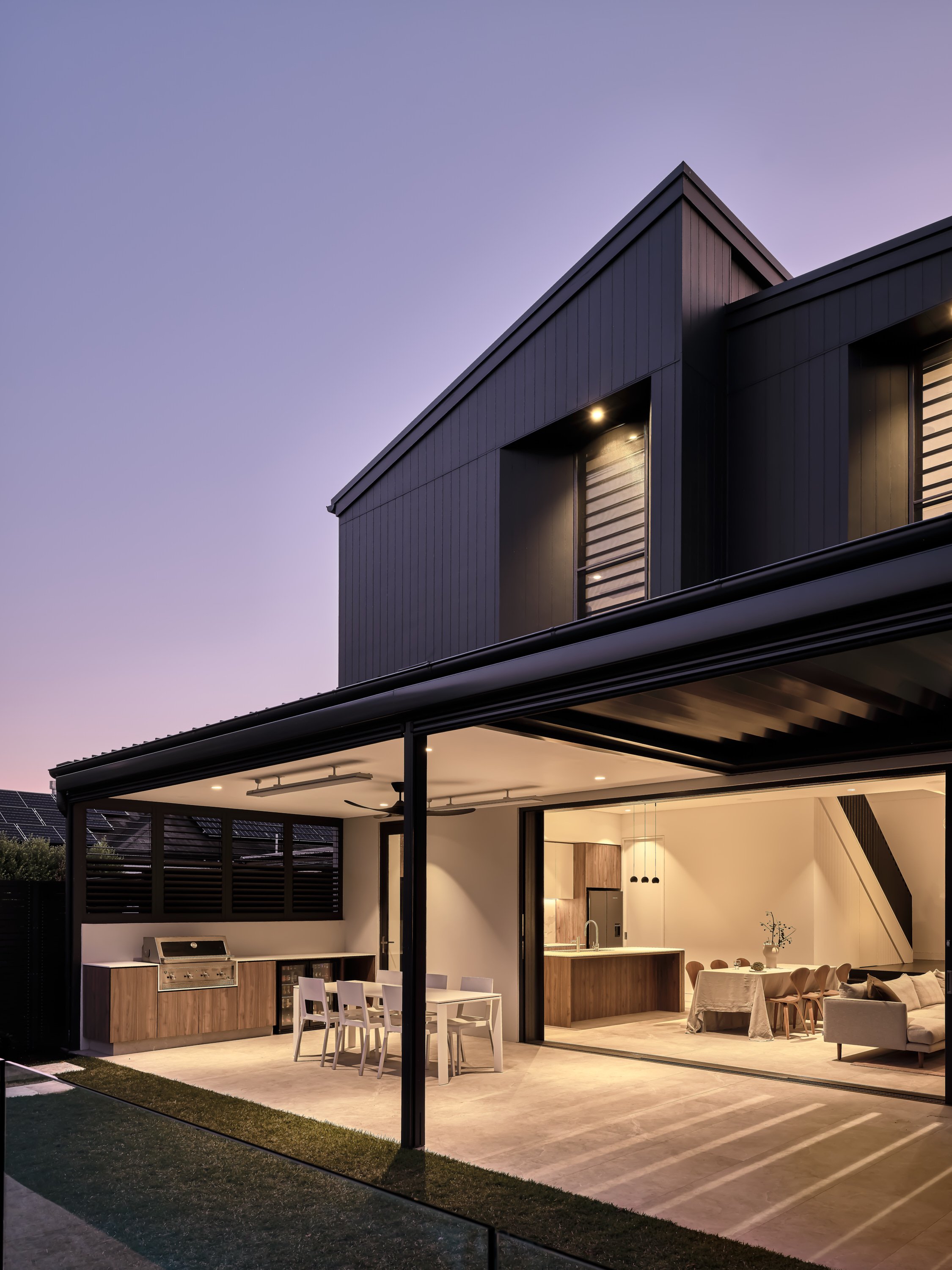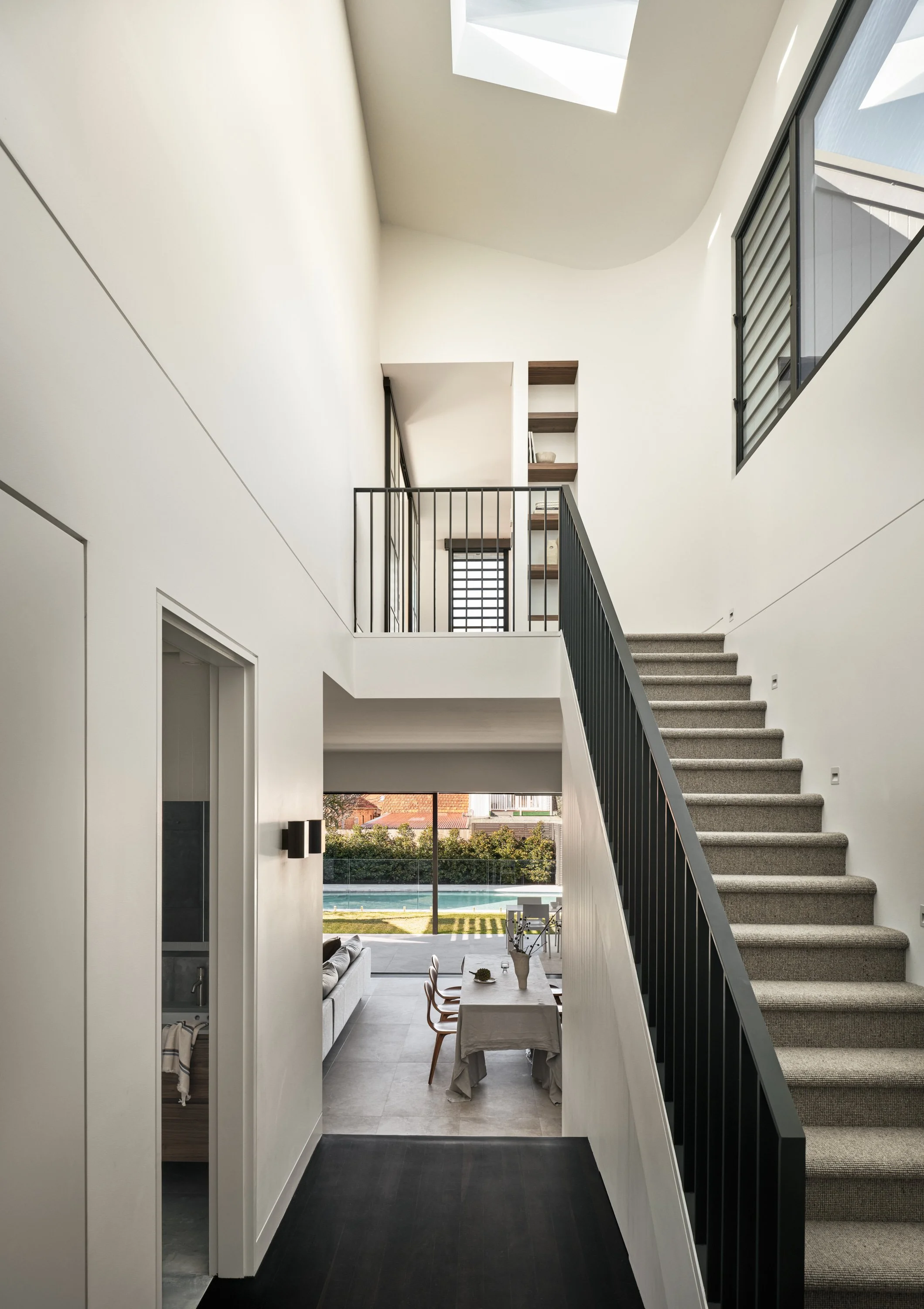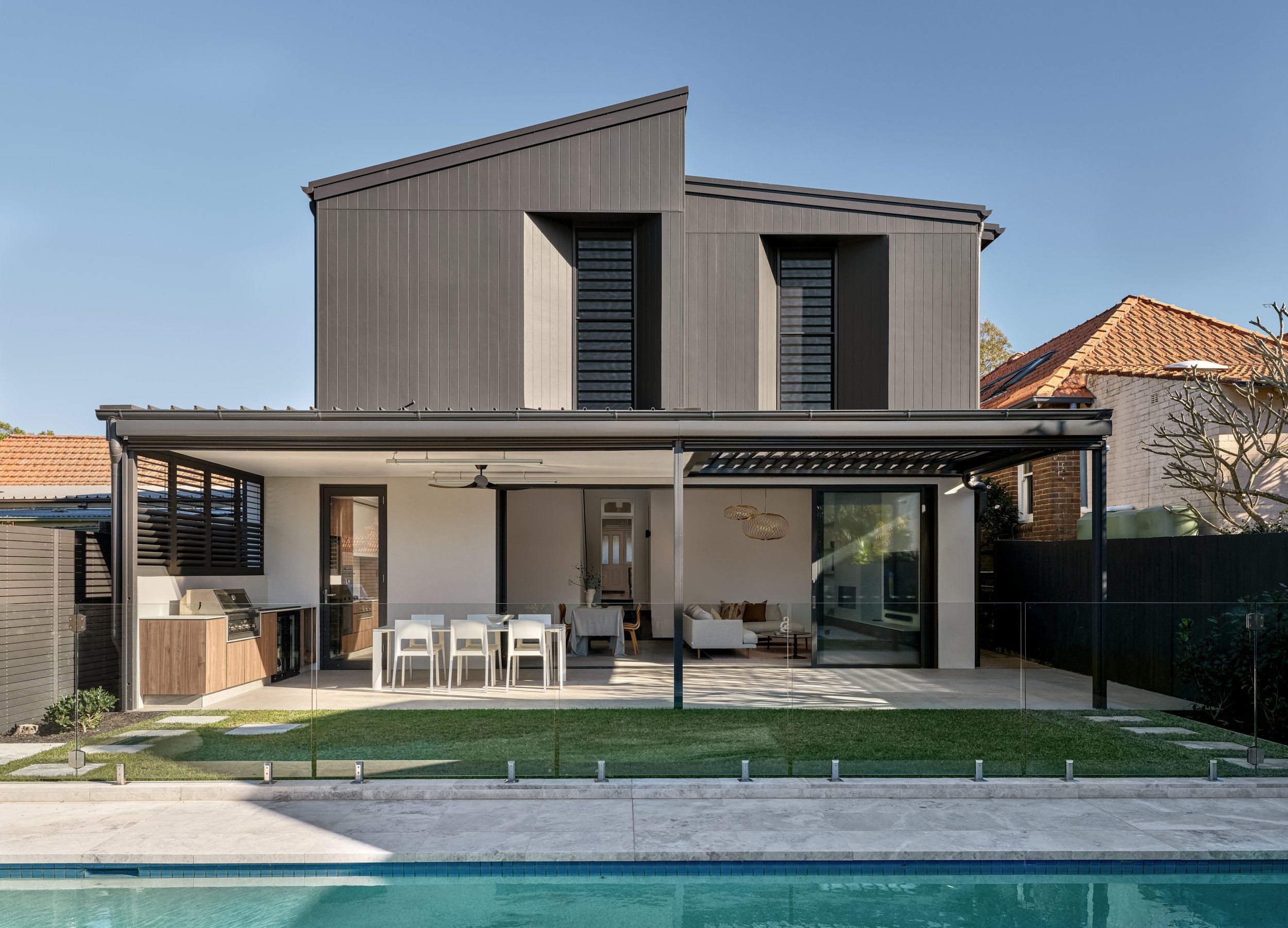A Mosman Federation cottage transformed by Shore Architects, where a striking dark-clad addition rises confidently behind a preserved heritage facade. The brief called for a family home built around togetherness - spaces that flow toward the pool and outdoor entertaining area - and the shoot was designed to reflect that openness. A double-height void draws the eye from the entry hall through to the rear of the home, and the photography followed that journey, moving from the warm timber and stone of the kitchen and living spaces through to the rear deck and pool at dusk.