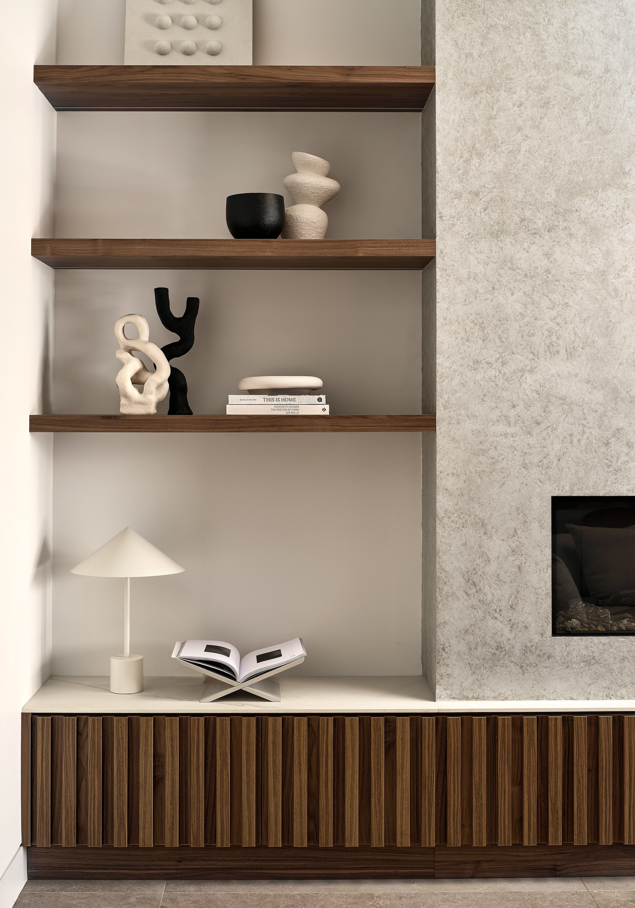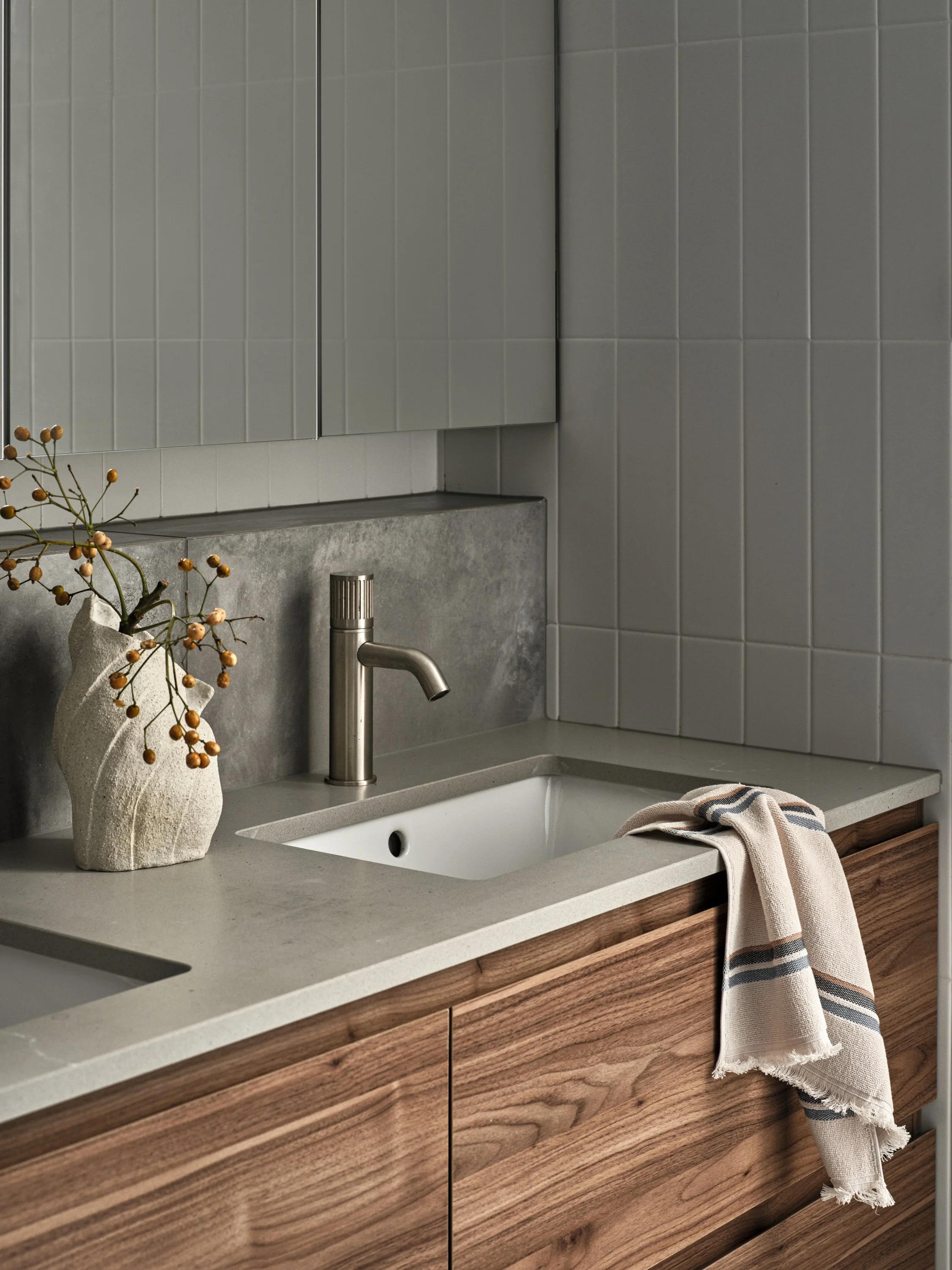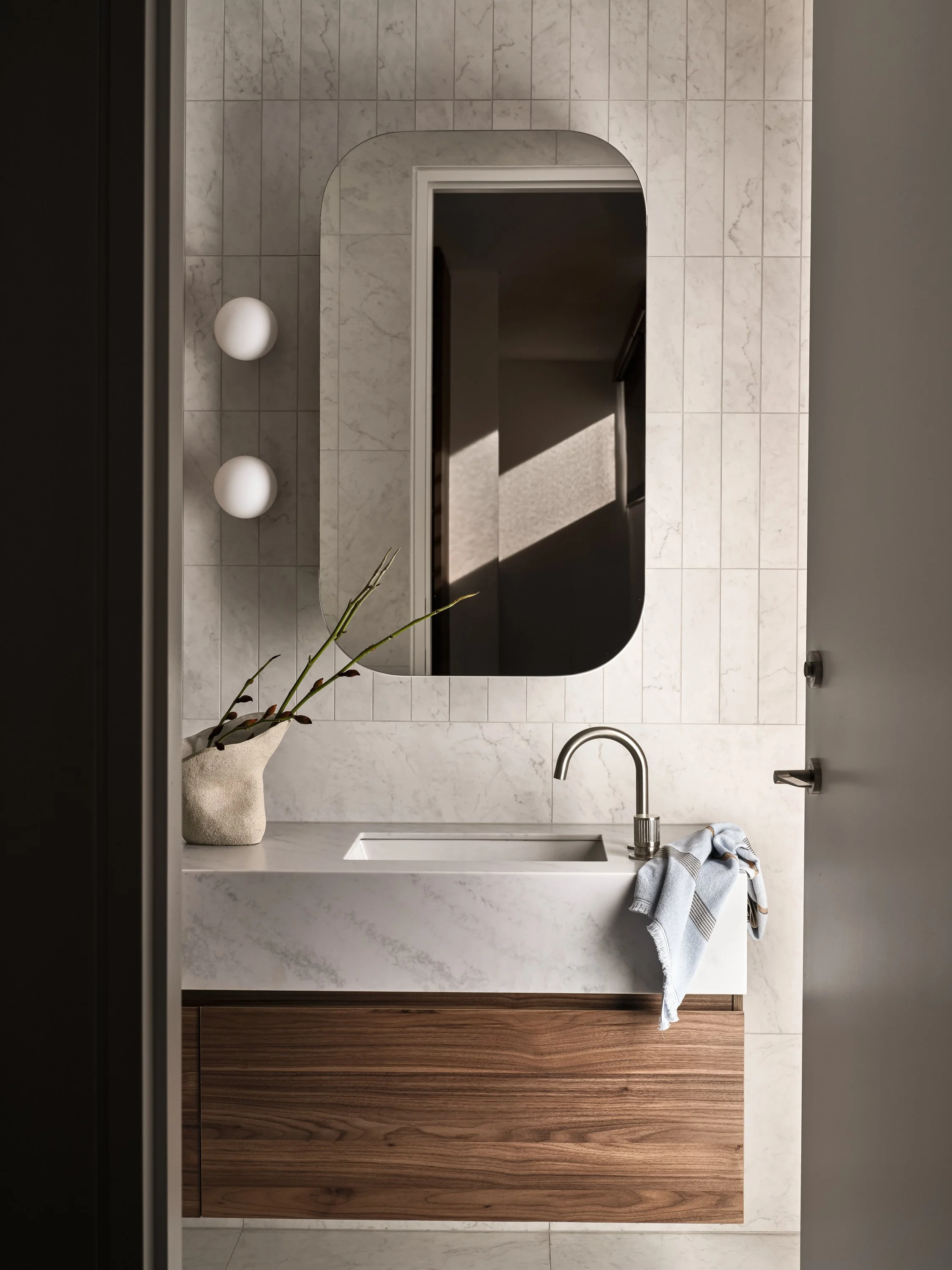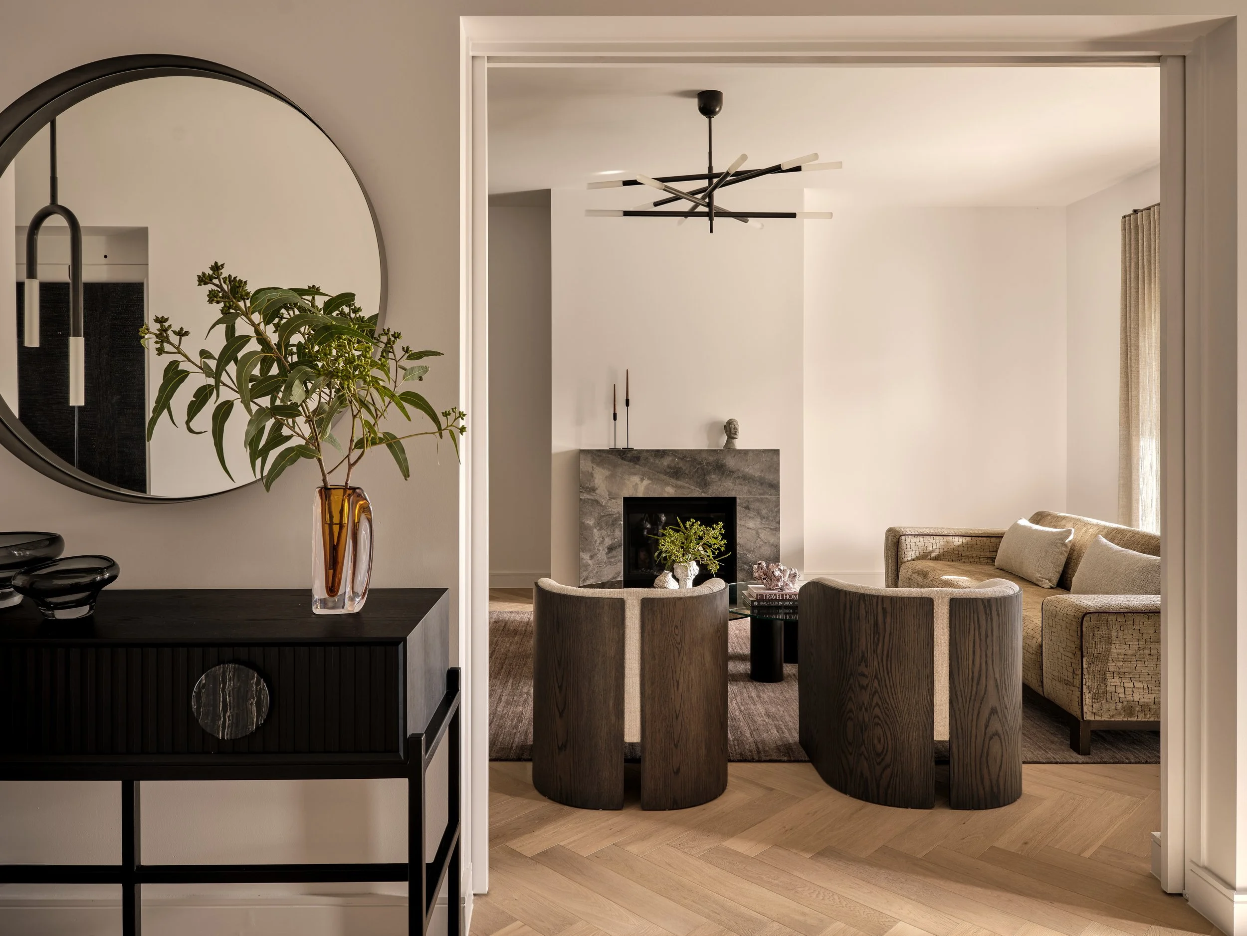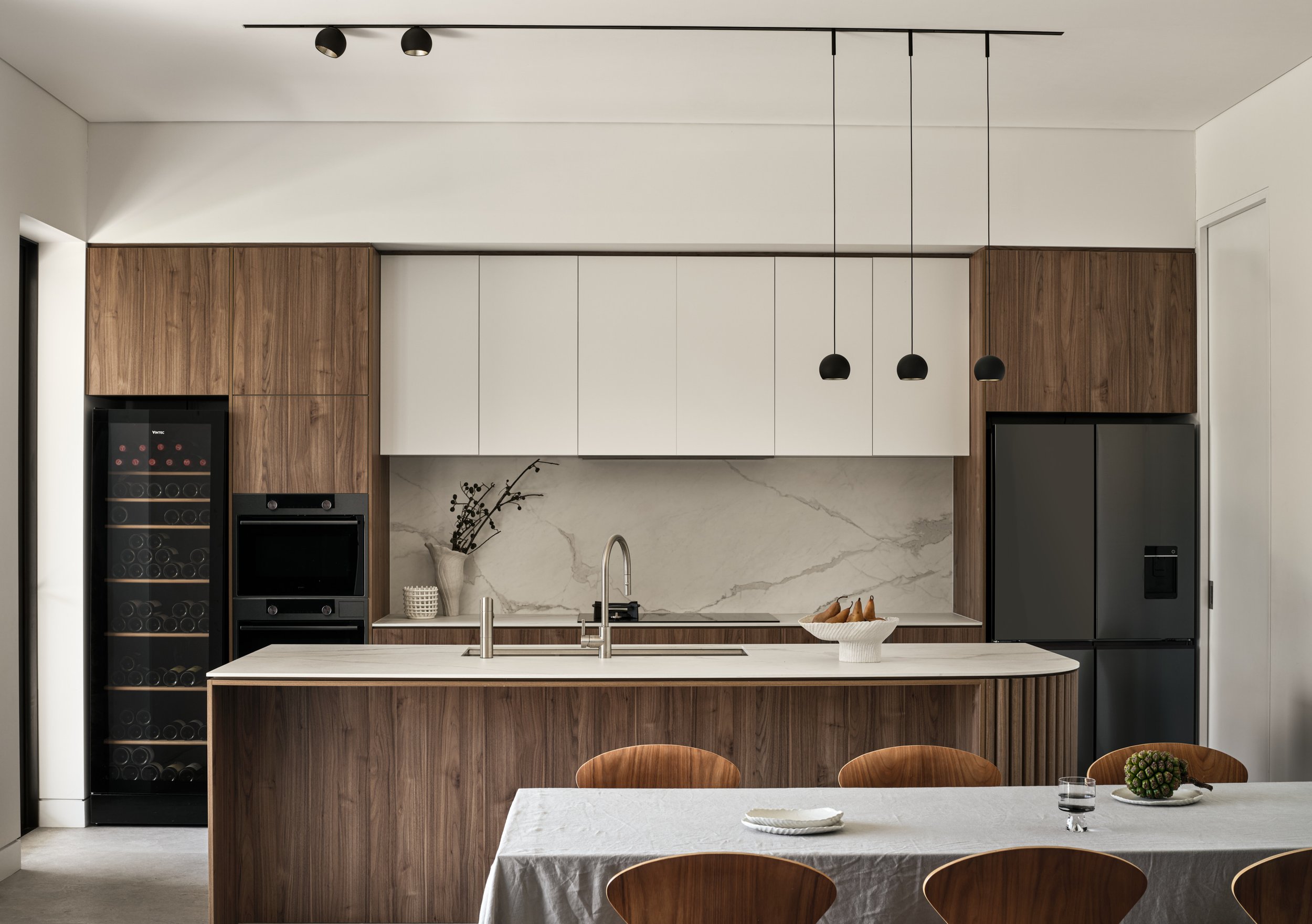 A Mosman Federation cottage transformed by Shore Architects, where a striking dark-clad addition rises confidently behind a preserved heritage facade. The brief called for a family home built around togetherness - spaces that flow toward the pool and outdoor entertaining area - and the shoot was designed to reflect that openness. A double-height void draws the eye from the entry hall through to the rear of the home, and the photography followed that journey, moving from the warm timber and stone of the kitchen and living spaces through to the rear deck and pool at dusk.