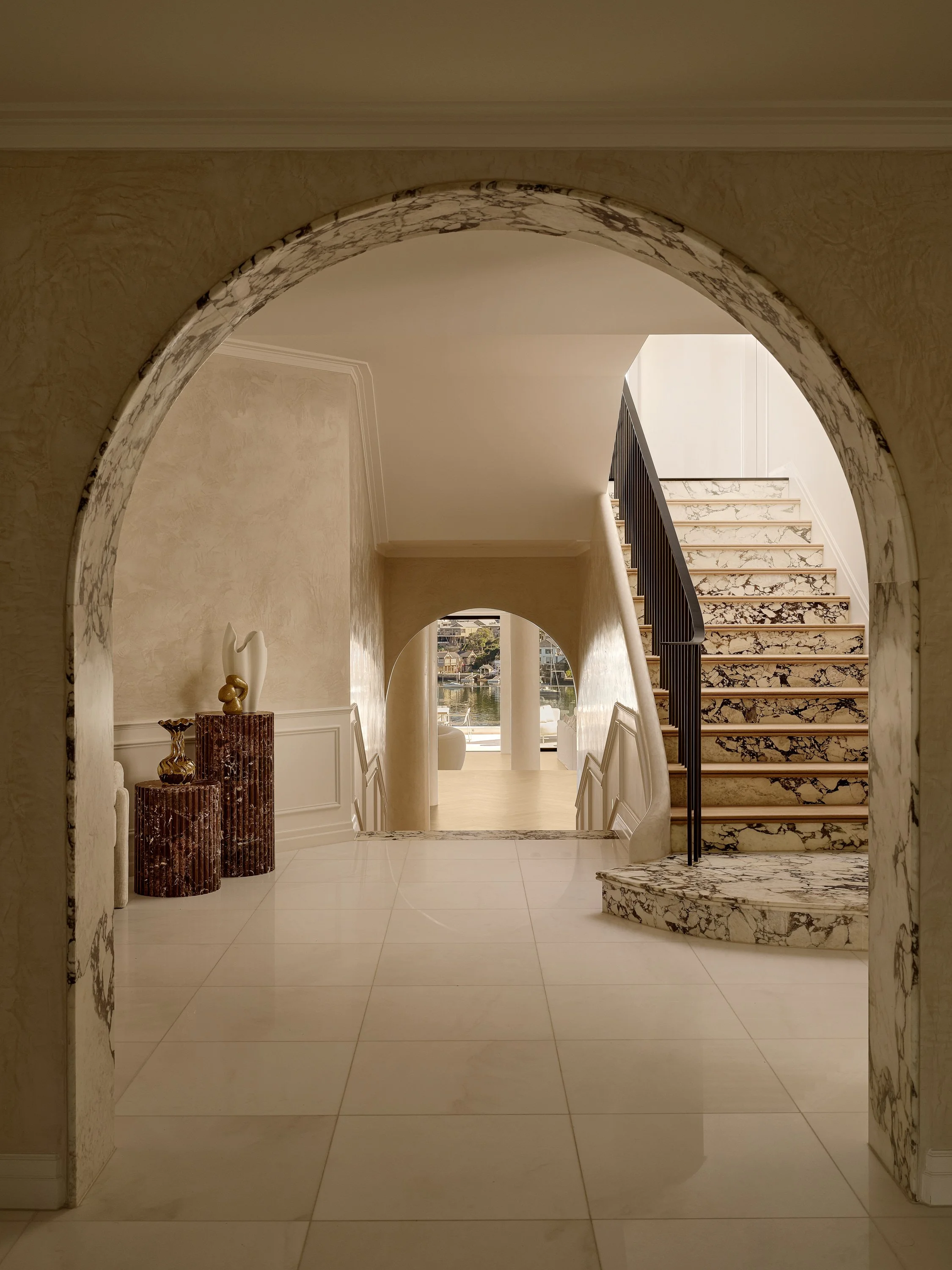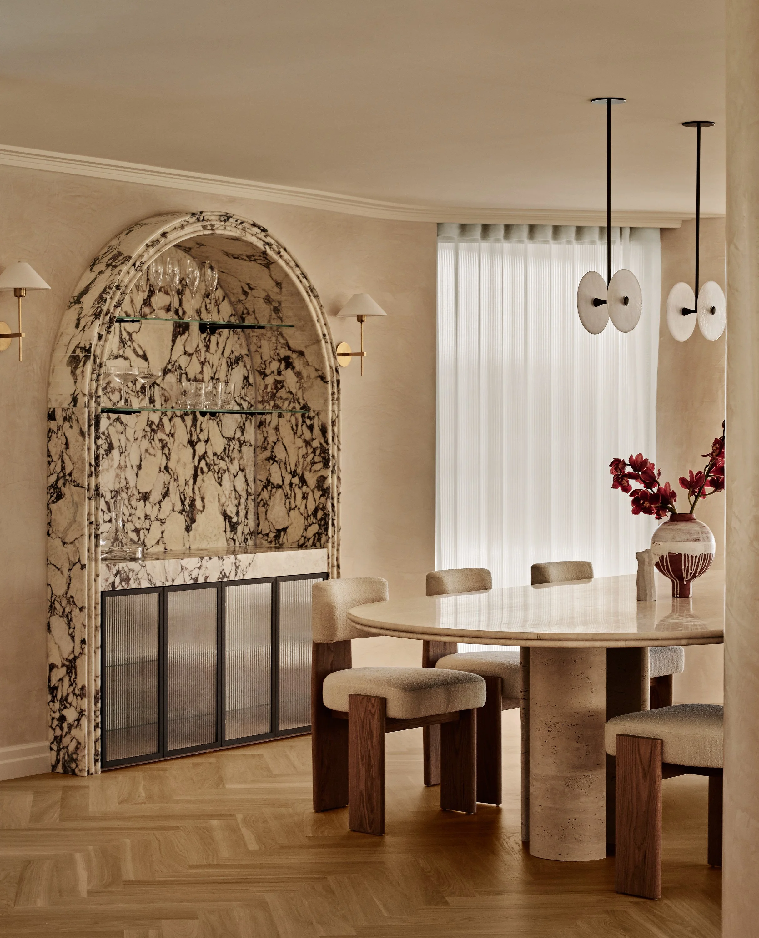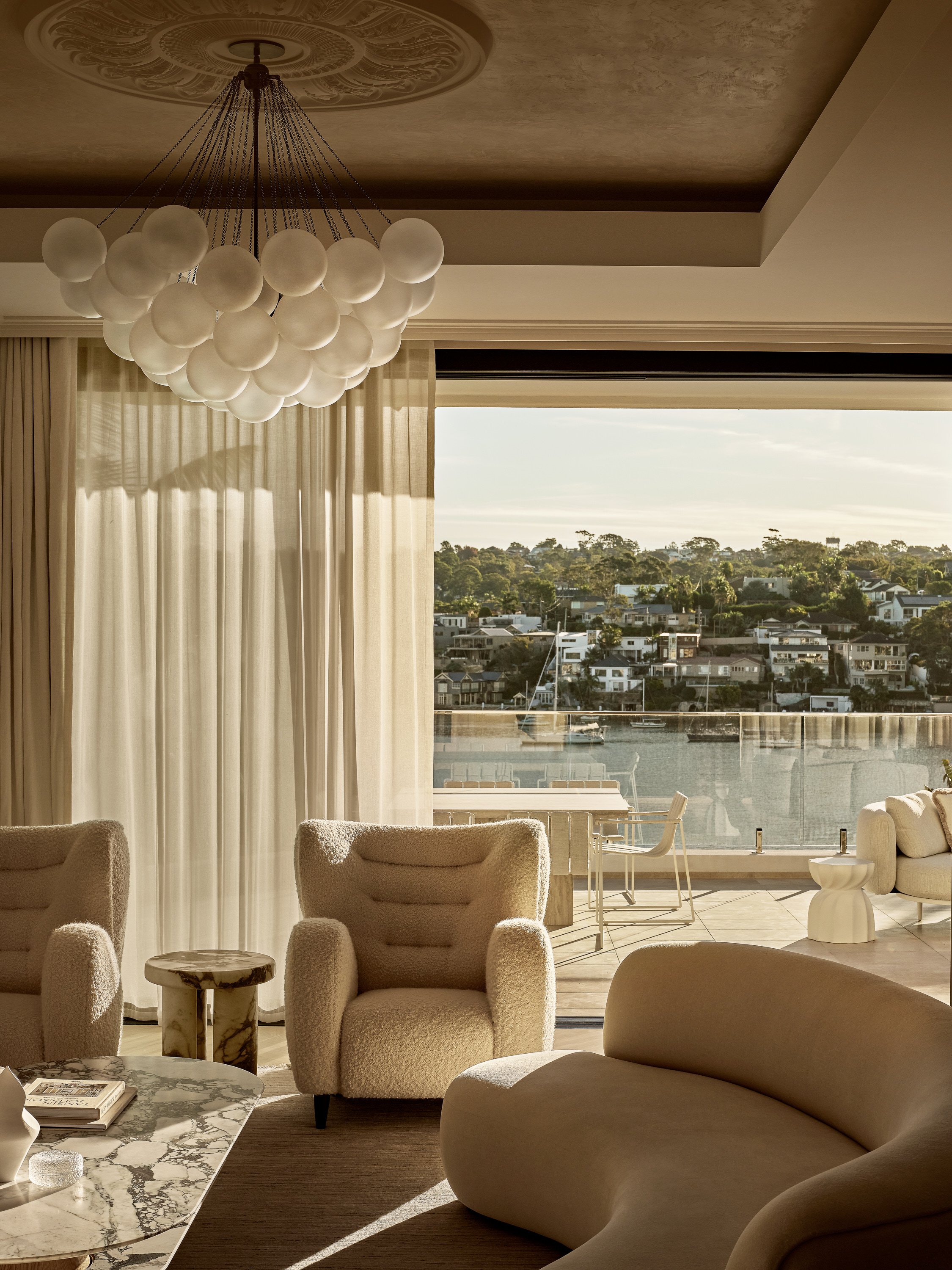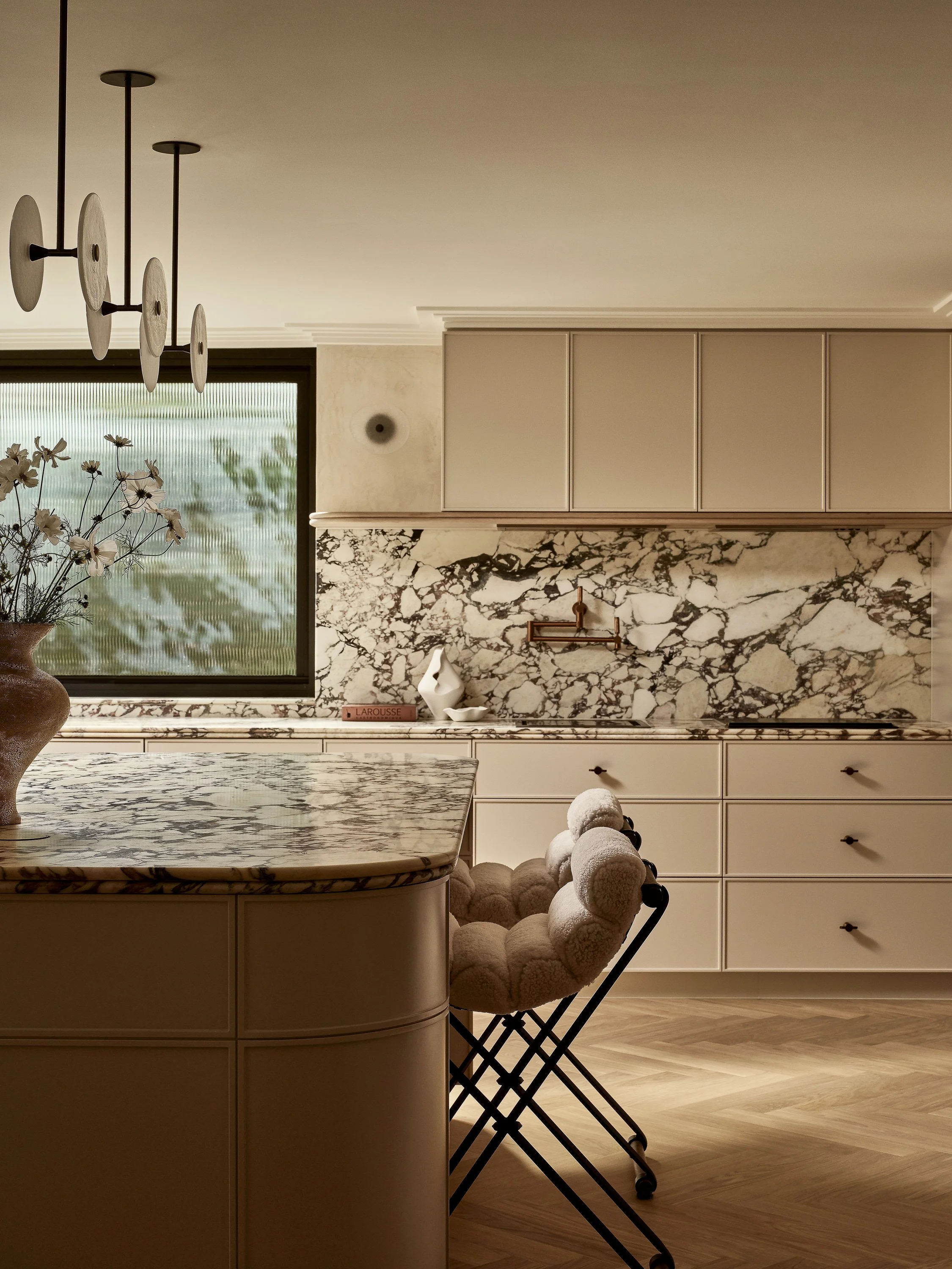 This waterfront home blends understated Parisian elegance with the relaxed sensibility of Sydney living. The interiors layer soft neutral tones, natural textures and refined detailing to create a sense of quiet sophistication. Bespoke furniture and custom pieces were incorporated throughout, reinforcing the home’s tailored aesthetic and sense of cohesion. Captured across the day, the shoot highlights how light interacts with stone, timber and brass to reveal the home’s balance of craftsmanship, materiality and warmth.