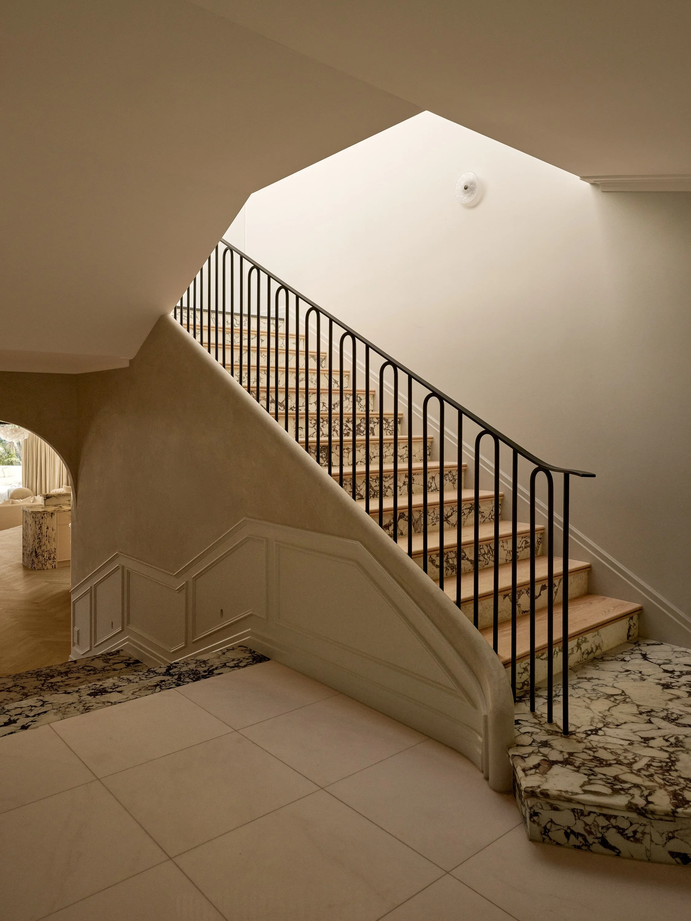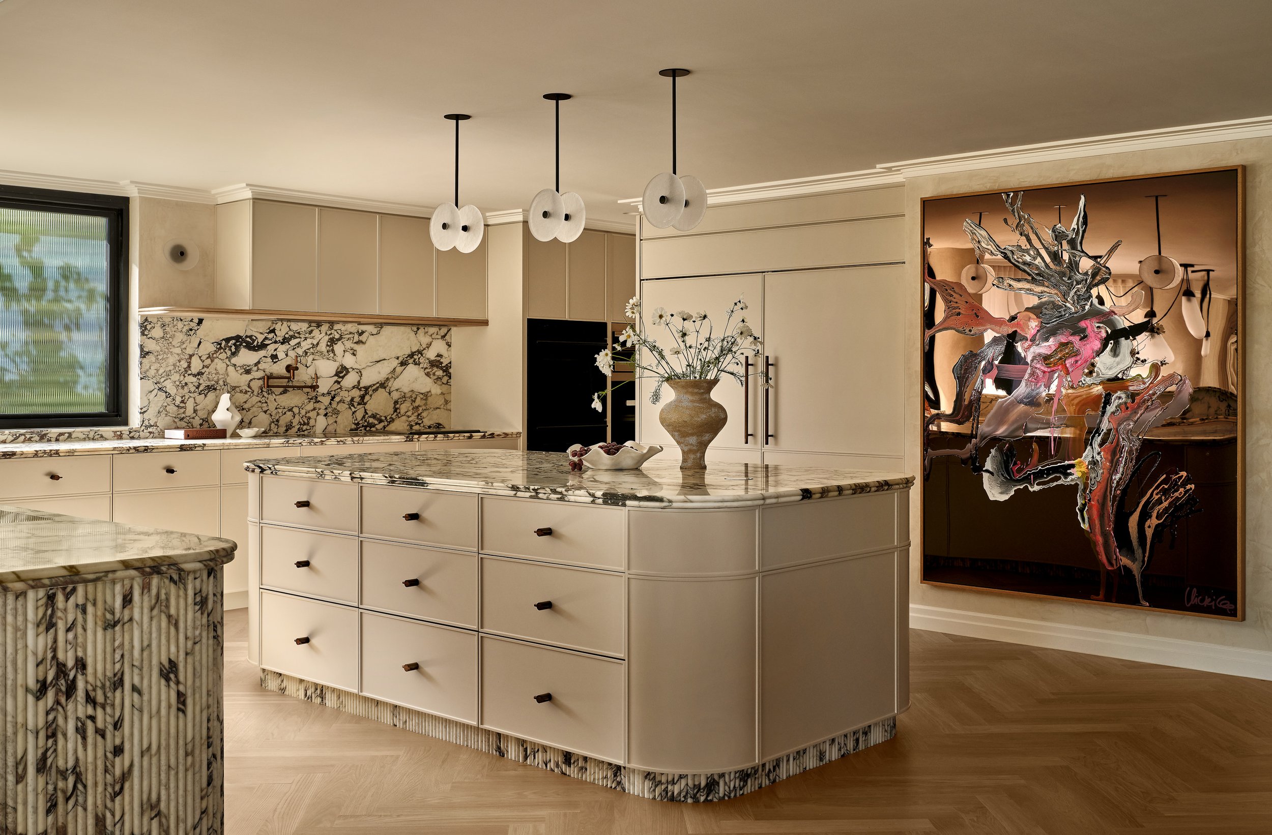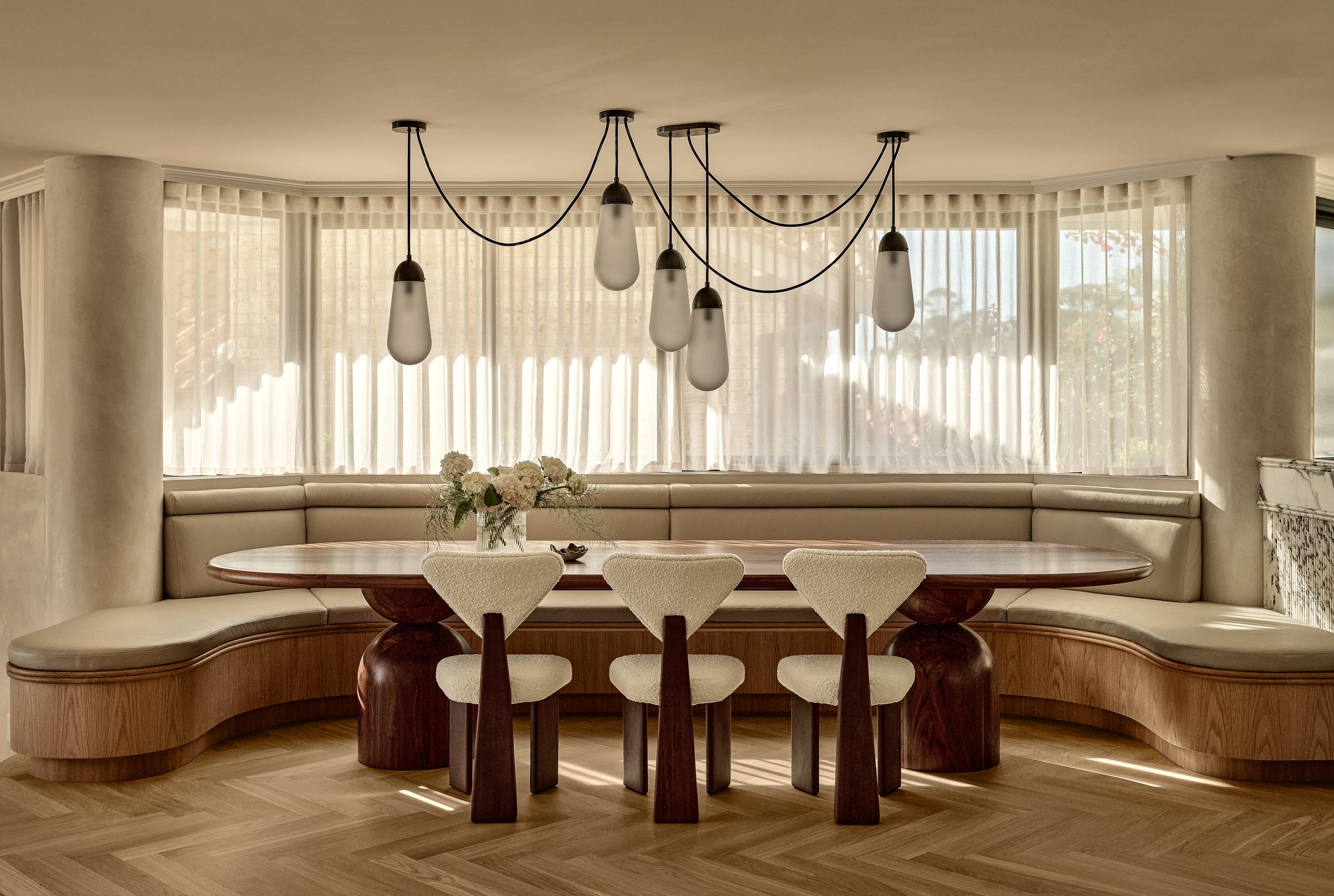 This waterfront home blends understated Parisian elegance with the relaxed sensibility of Sydney living. The interiors layer soft neutral tones, natural textures and refined detailing to create a sense of quiet sophistication. Bespoke furniture and custom pieces were incorporated throughout, reinforcing the home’s tailored aesthetic and sense of cohesion. Captured across the day, the shoot highlights how light interacts with stone, timber and brass to reveal the home’s balance of craftsmanship, materiality and warmth.