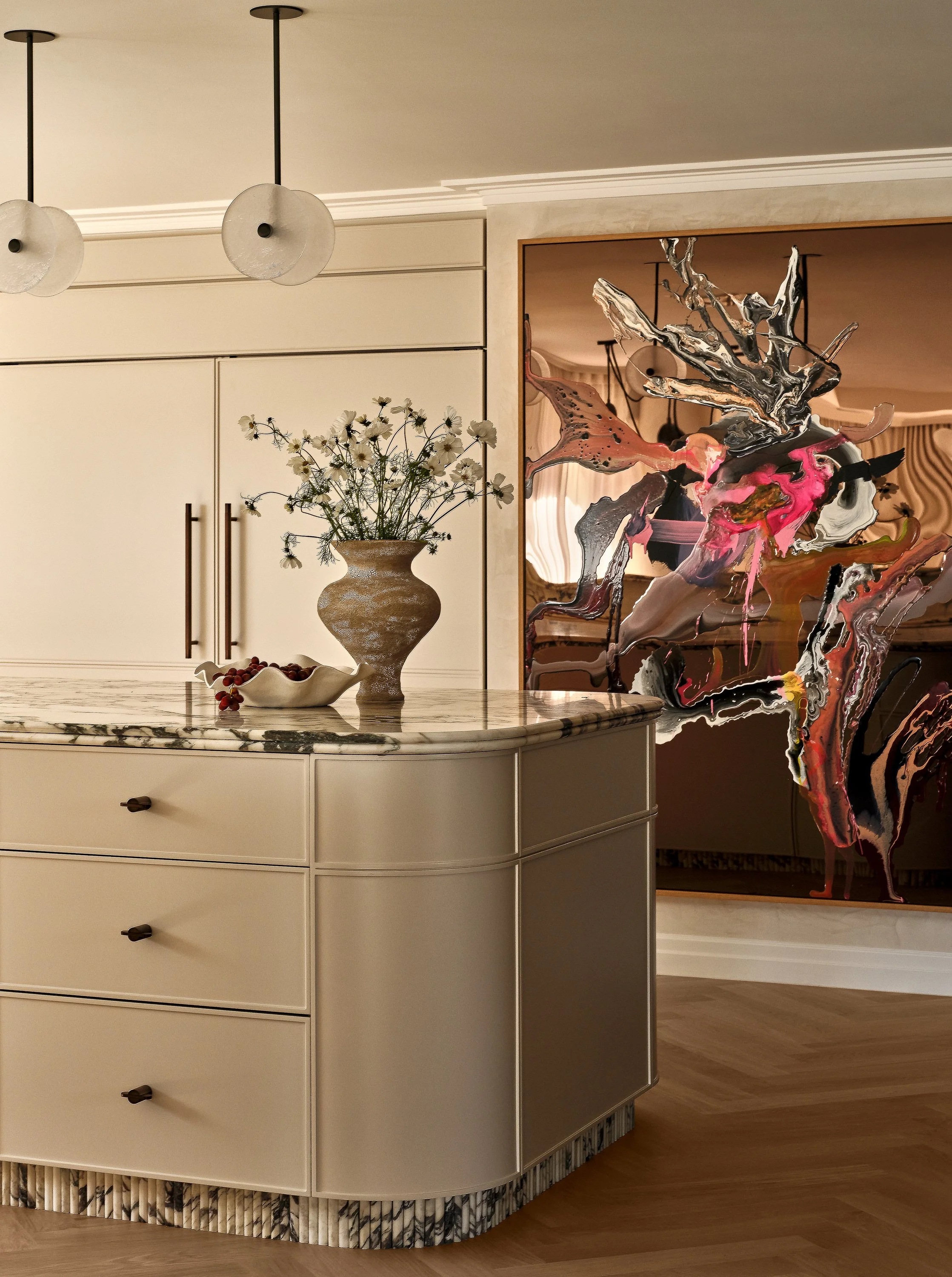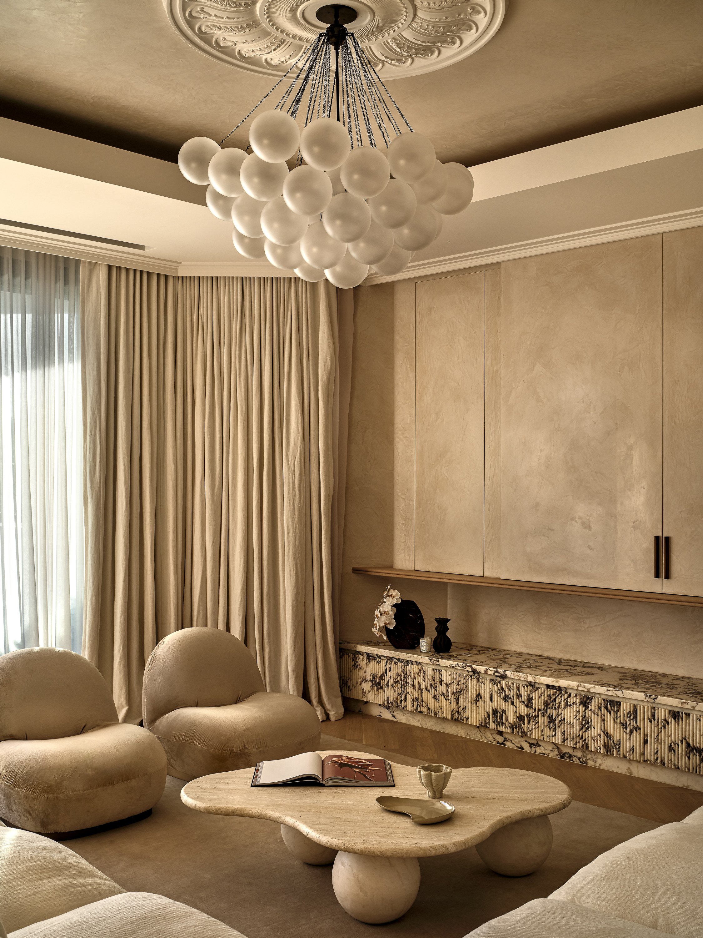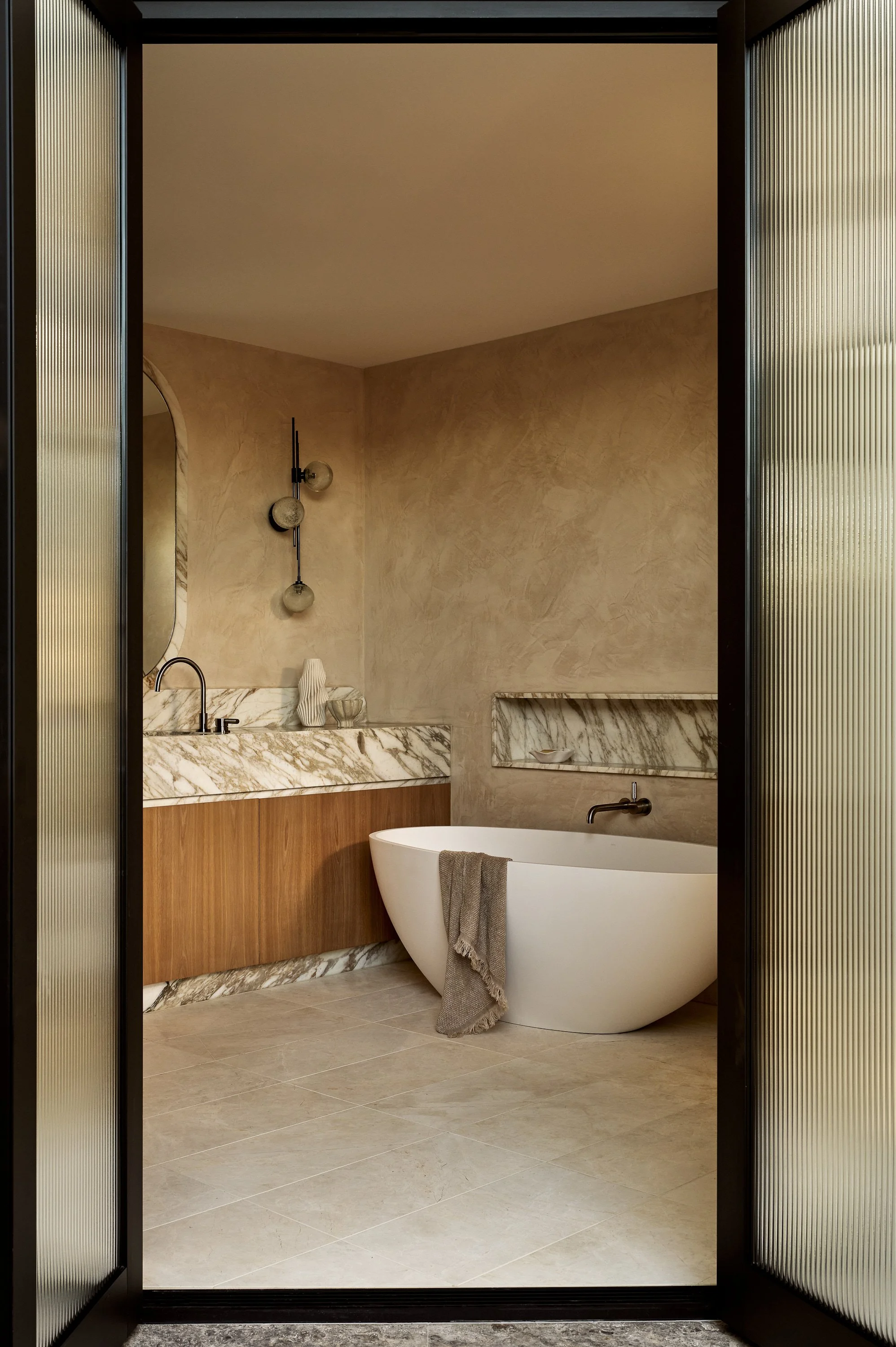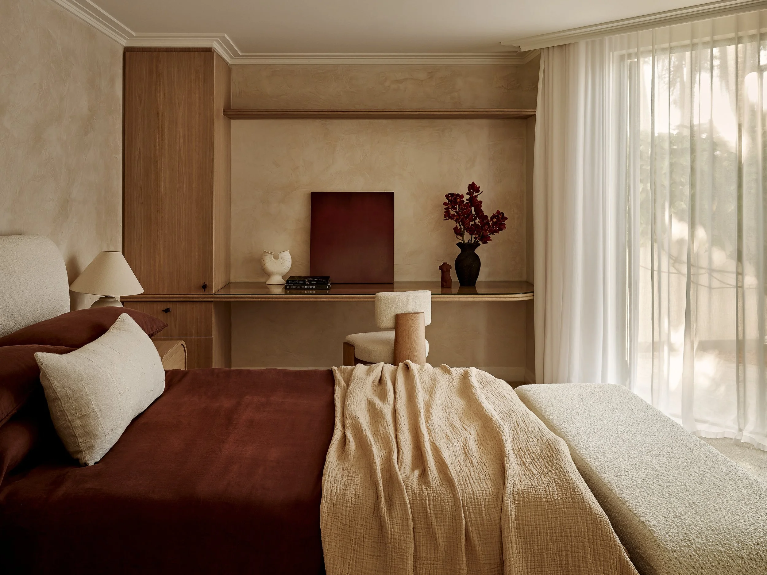 This waterfront home blends understated Parisian elegance with the relaxed sensibility of Sydney living. The interiors layer soft neutral tones, natural textures and refined detailing to create a sense of quiet sophistication. Bespoke furniture and custom pieces were incorporated throughout, reinforcing the home’s tailored aesthetic and sense of cohesion. Captured across the day, the shoot highlights how light interacts with stone, timber and brass to reveal the home’s balance of craftsmanship, materiality and warmth.