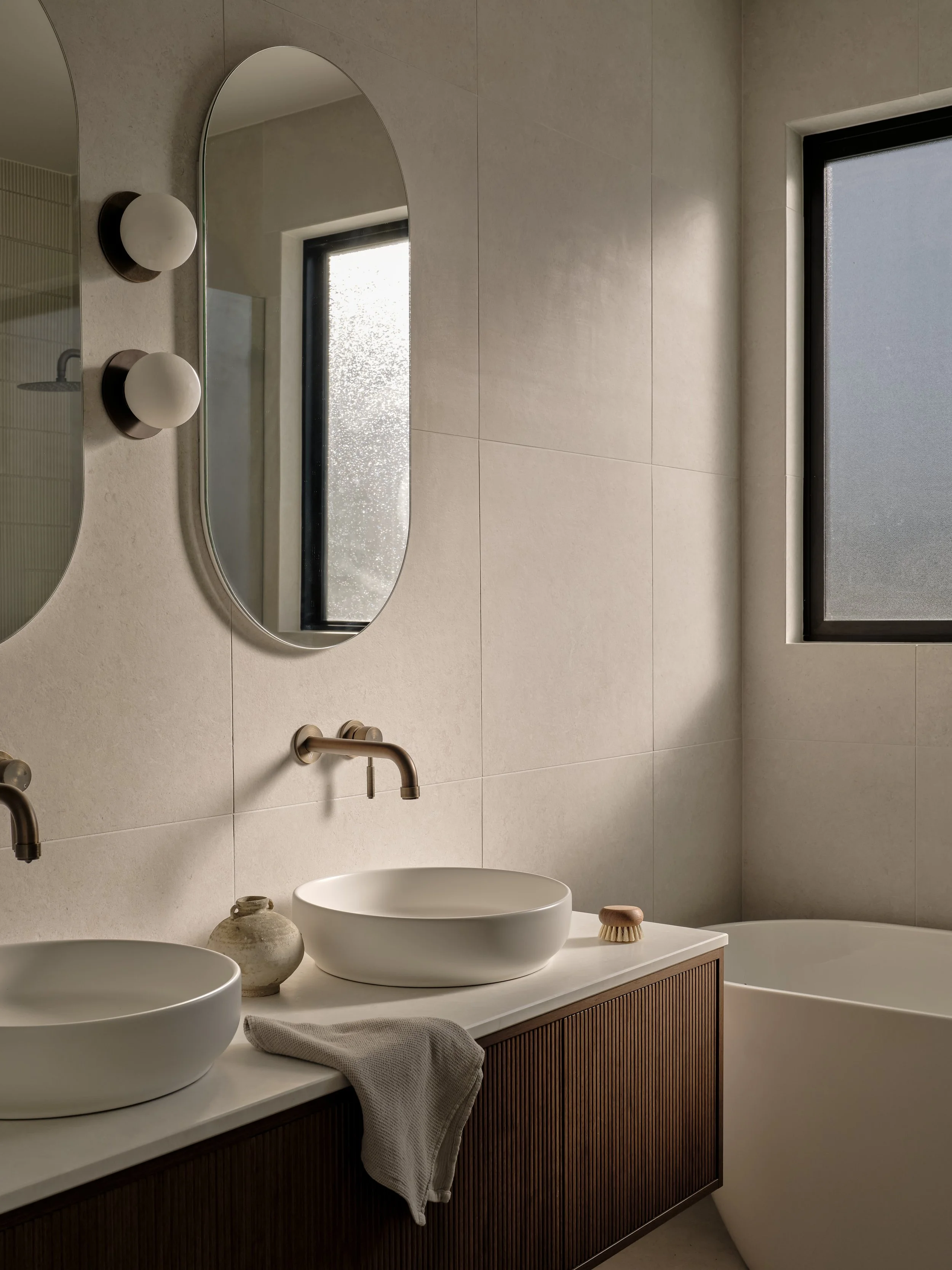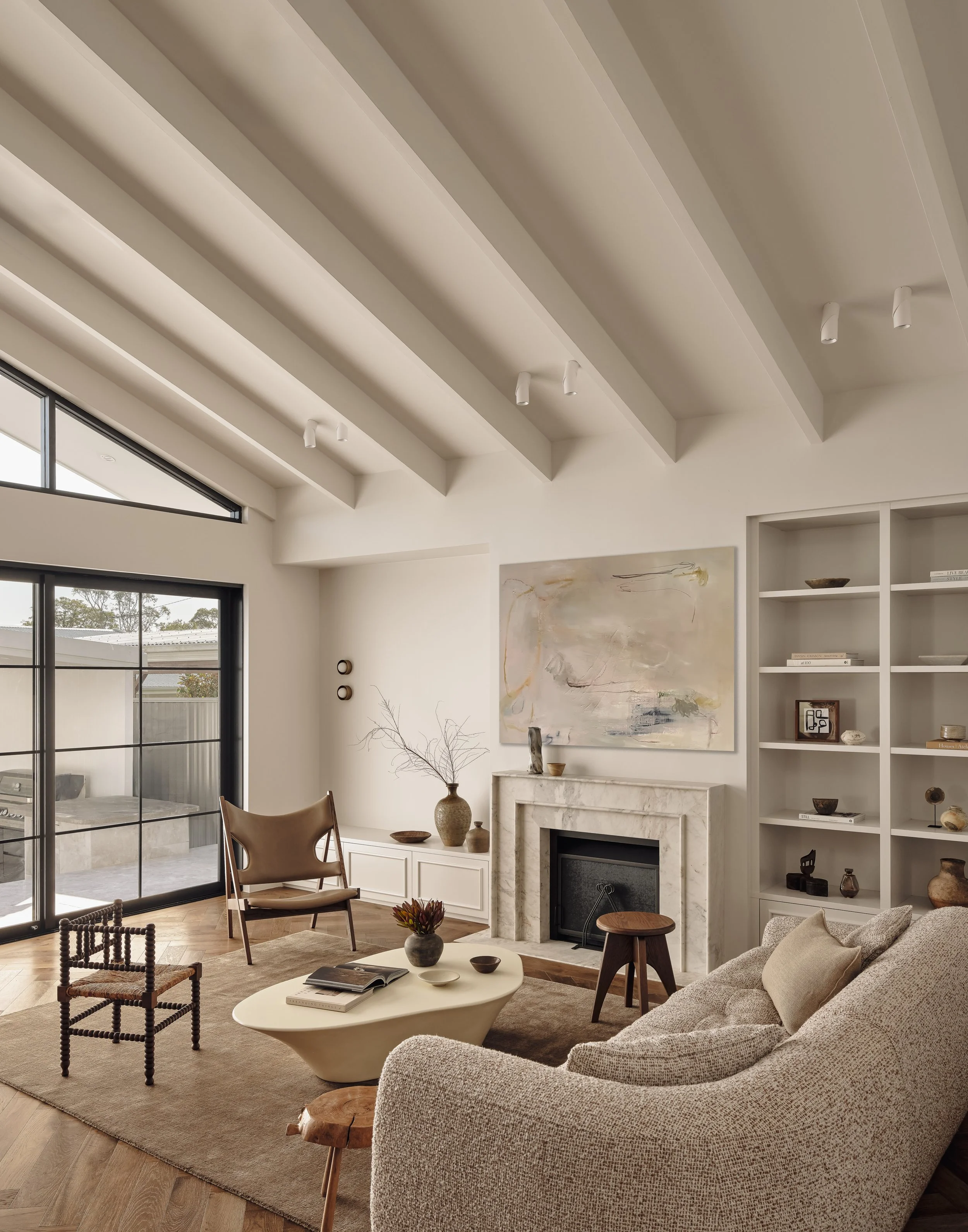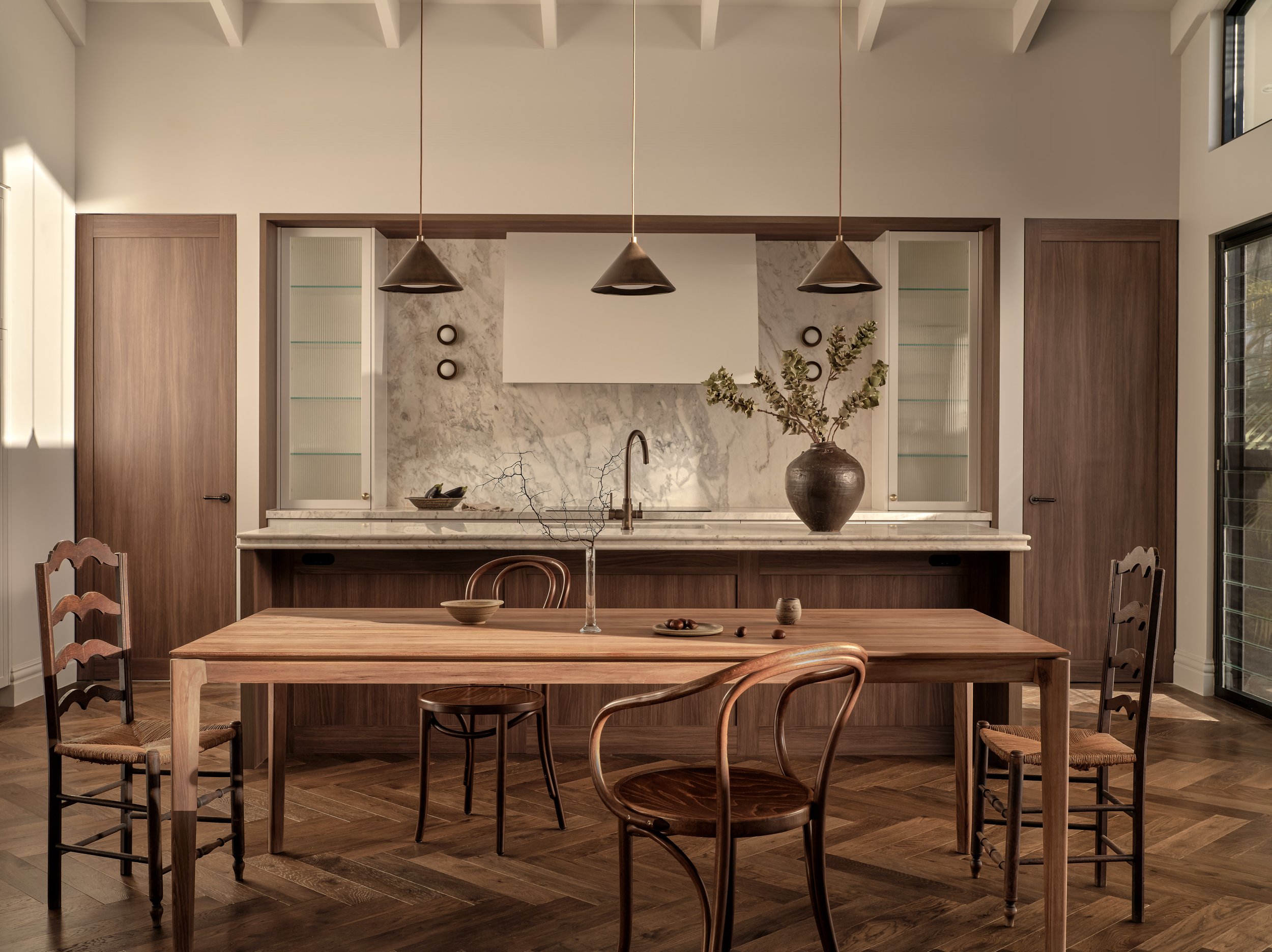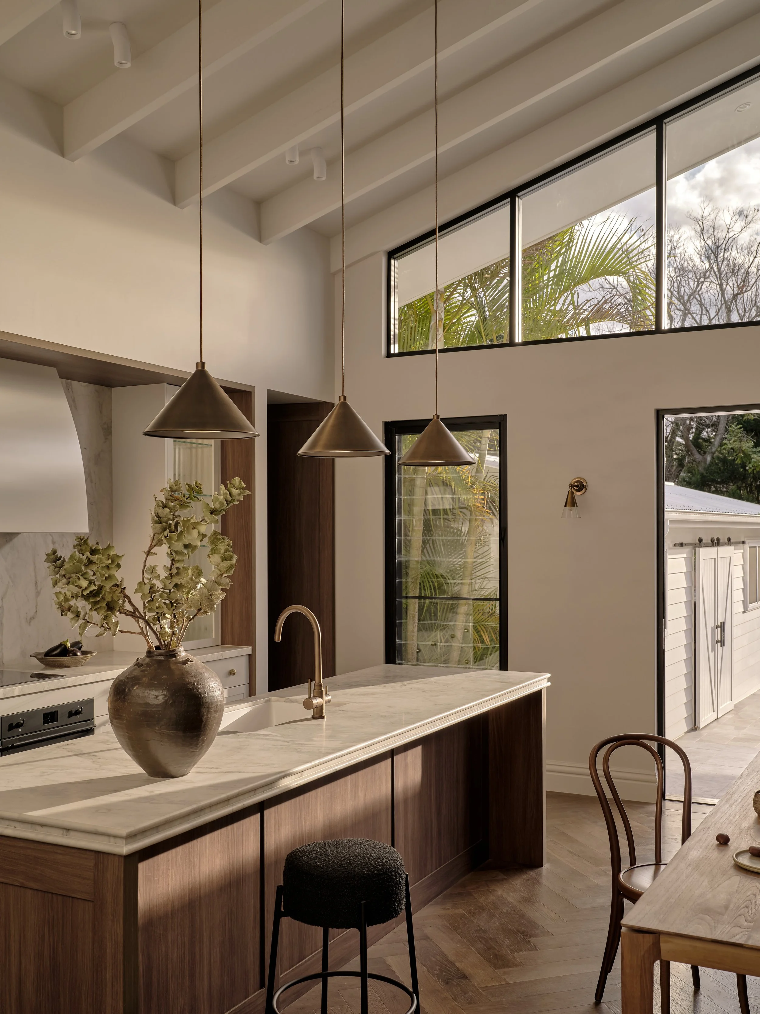 Project Yowie balances warmth, practicality, and refined design in a family home that feels both lived-in and composed. The layout flows seamlessly between kitchen, dining, and outdoor spaces, anchored by a long stone island and concealed storage that keeps the interiors calm and functional. Thoughtful joinery and a muted material palette create a sense of quiet order, while natural light softens the geometry of each space. The series was photographed with a focus on subtle textures and tonal balance, maintaining a refined, subdued mood that reflects the home’s understated elegance and everyday rhythm.