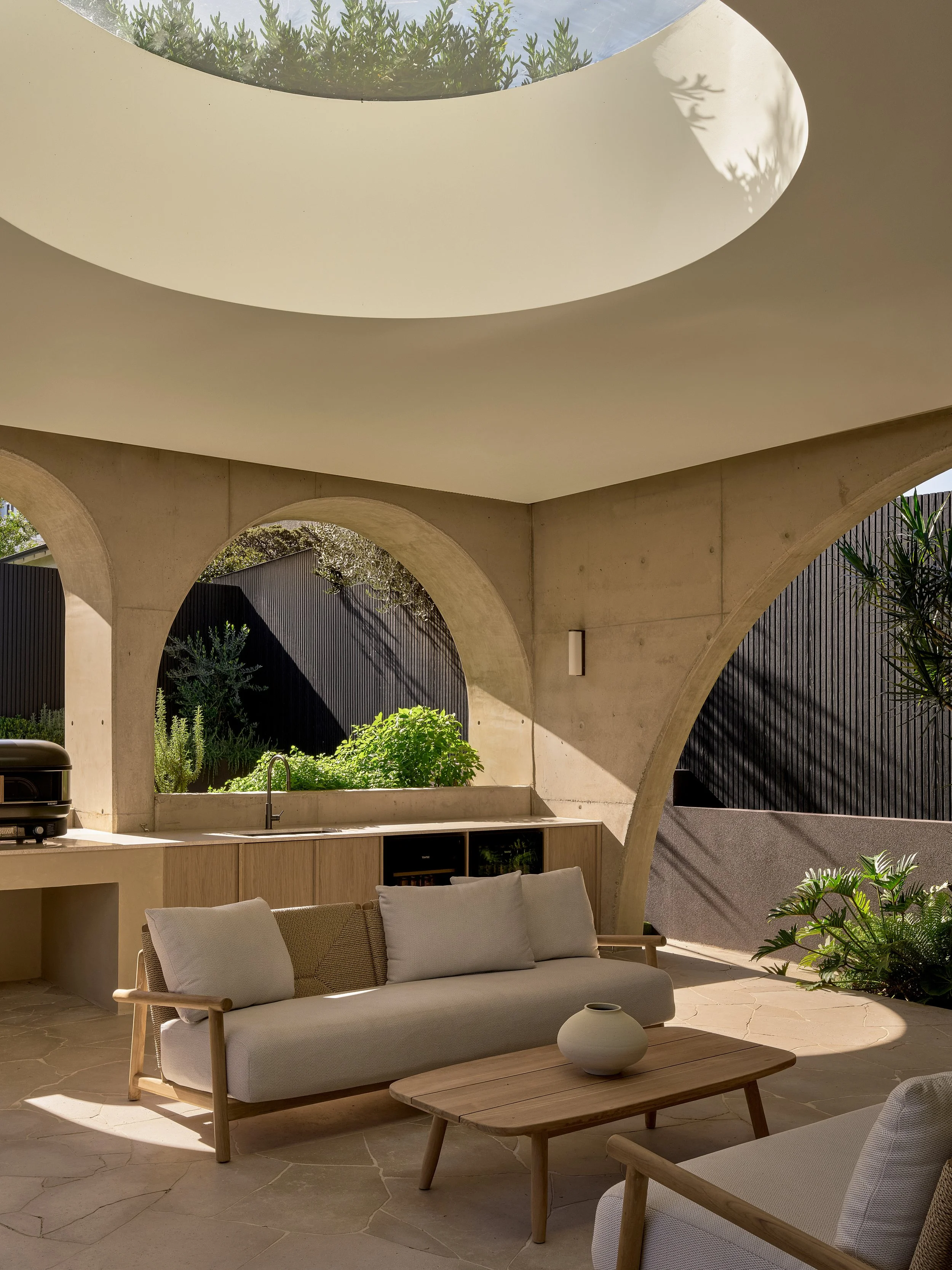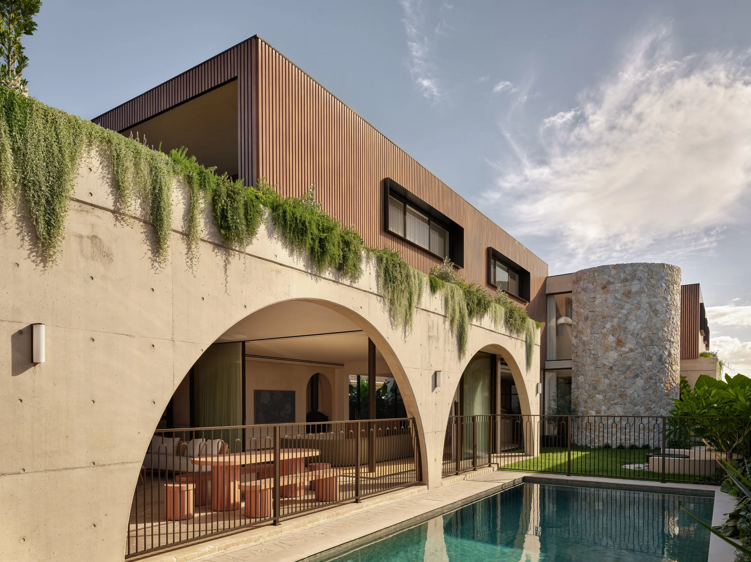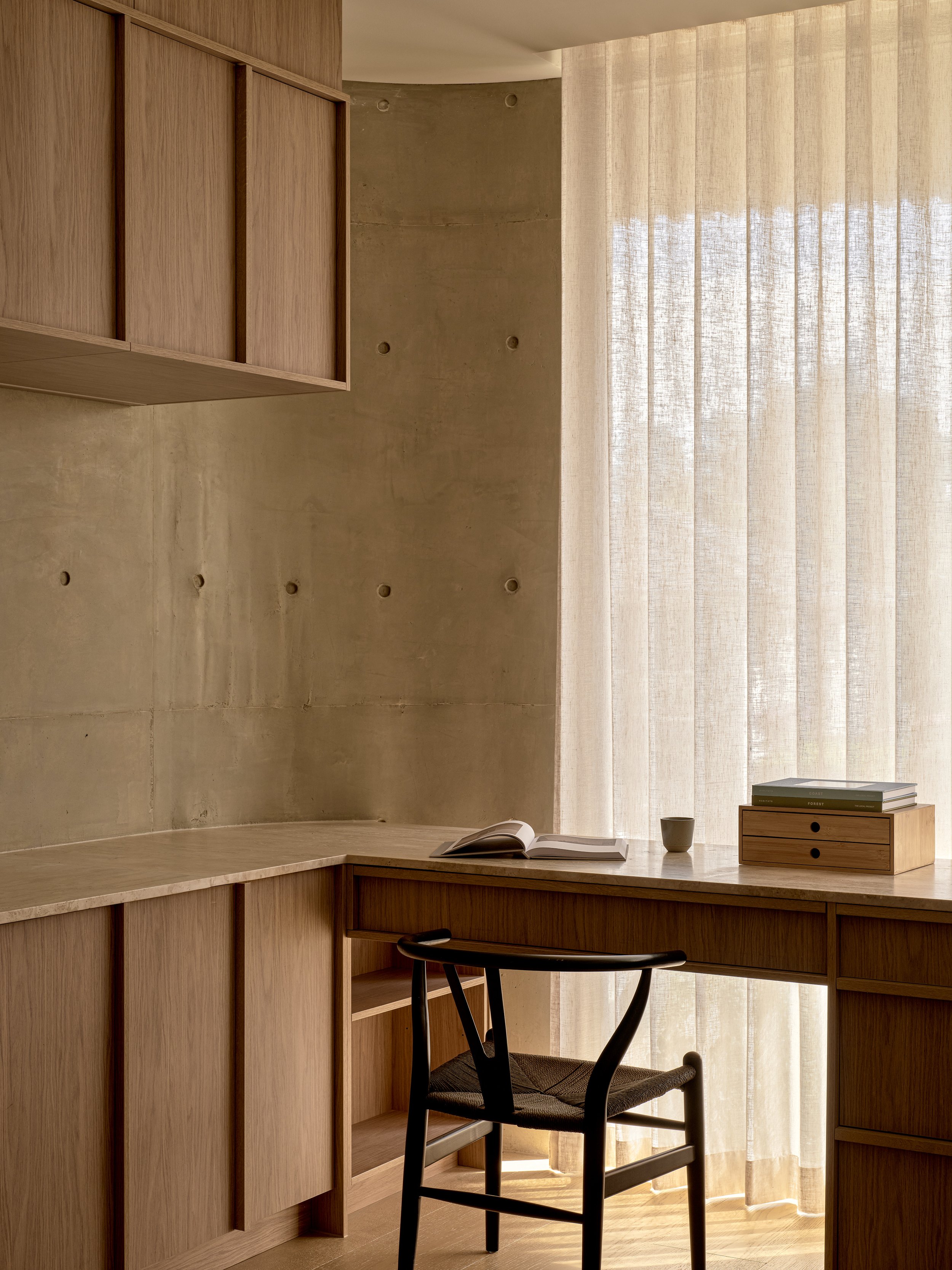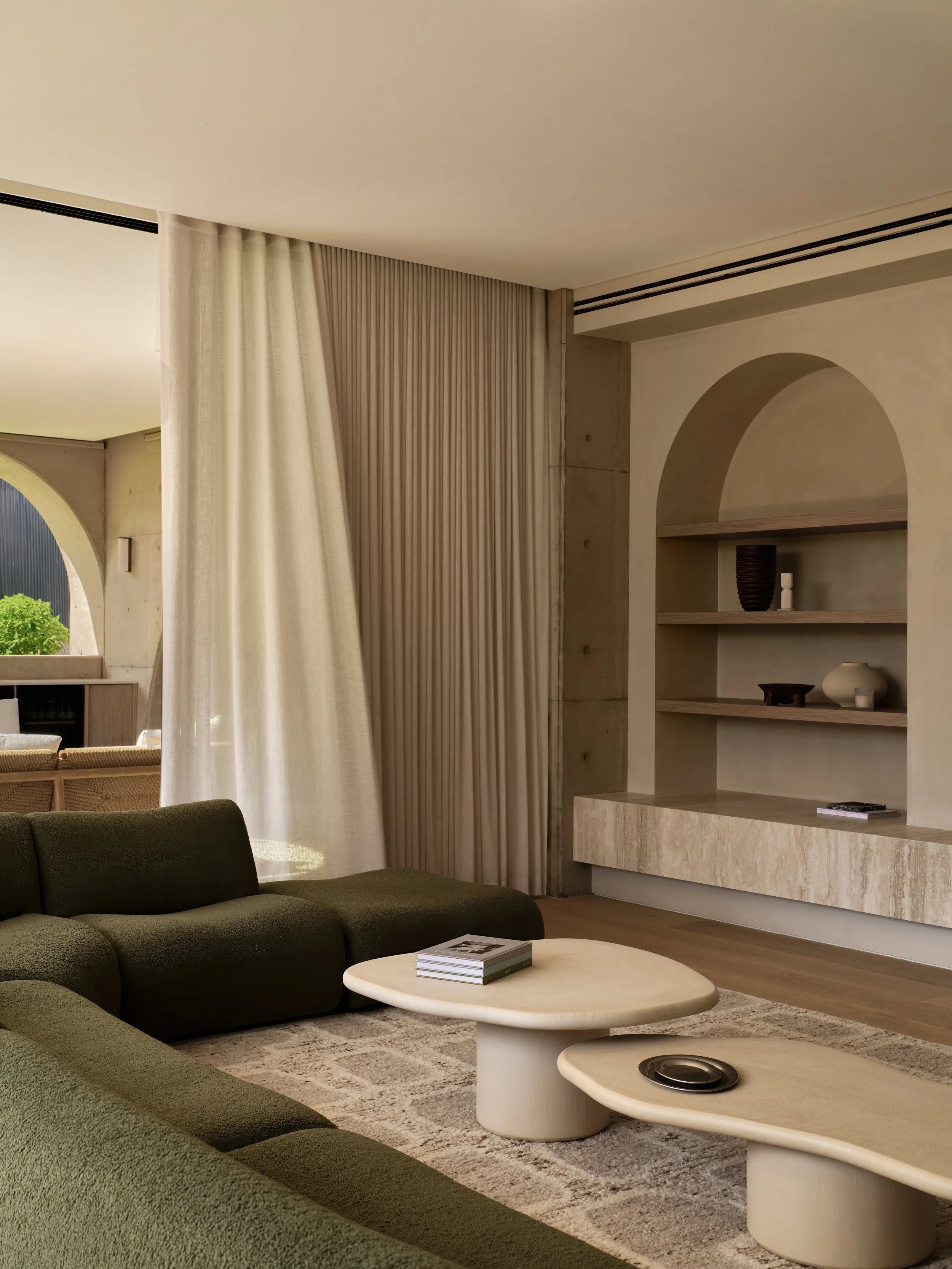 Turner House by Habitat Housing is a study in sculptural concrete and warm natural materials. The arched forms that define the architecture - from the poolside loggia to the circular outdoor pavilion - gave endless opportunities to explore how light shifts across raw surfaces throughout the day. Travertine, aged oak, and hand-finished plaster create a palette that rewards close attention, and the project was shot to reflect that, finding the quiet moments as much as the grand ones.